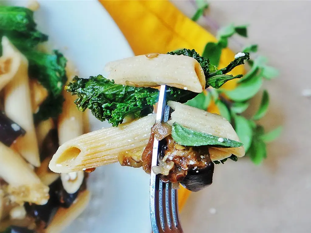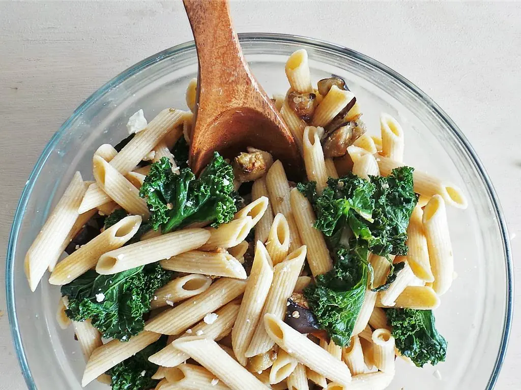 This summer pasta has spicy wilted kale and garlic, salty roasted eggplant, feta crumble, a splash of lemon, and al dente whole wheat penne. If you have any, toss in some toasted pine nuts!