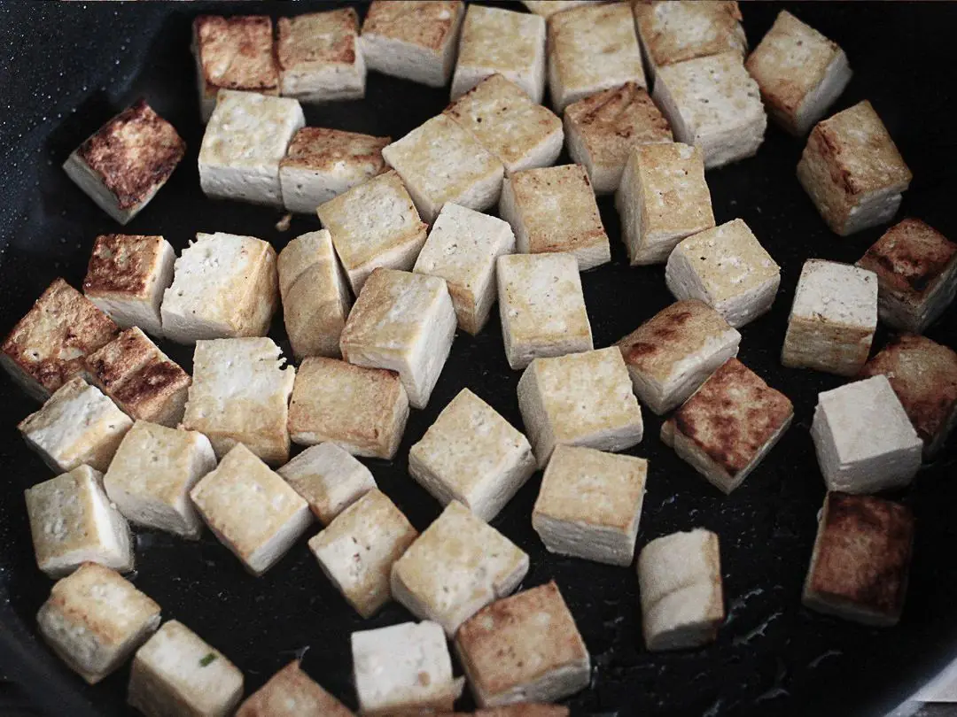 Heat the Vegetable Oil (1 Tbsp) in a large, non-stick pan, add the Firm Tofu (14 oz) and fry for 4-5 minutes until it turns slightly golden in color.