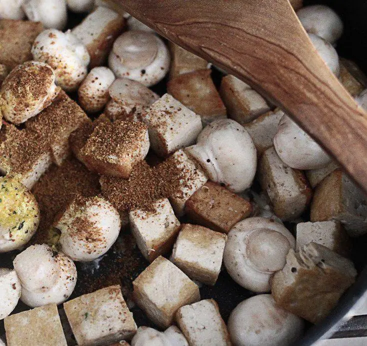 Add in Button Mushrooms (1 1/2 cups), Garlic (2 cloves), Vegetable Bouillon Cube (1 tsp), Jerk Seasoning (1 tsp), and Salt (1/2 tsp), stir-fry them gently for another 5 minutes, set aside. And allow to cool for 5 minutes.