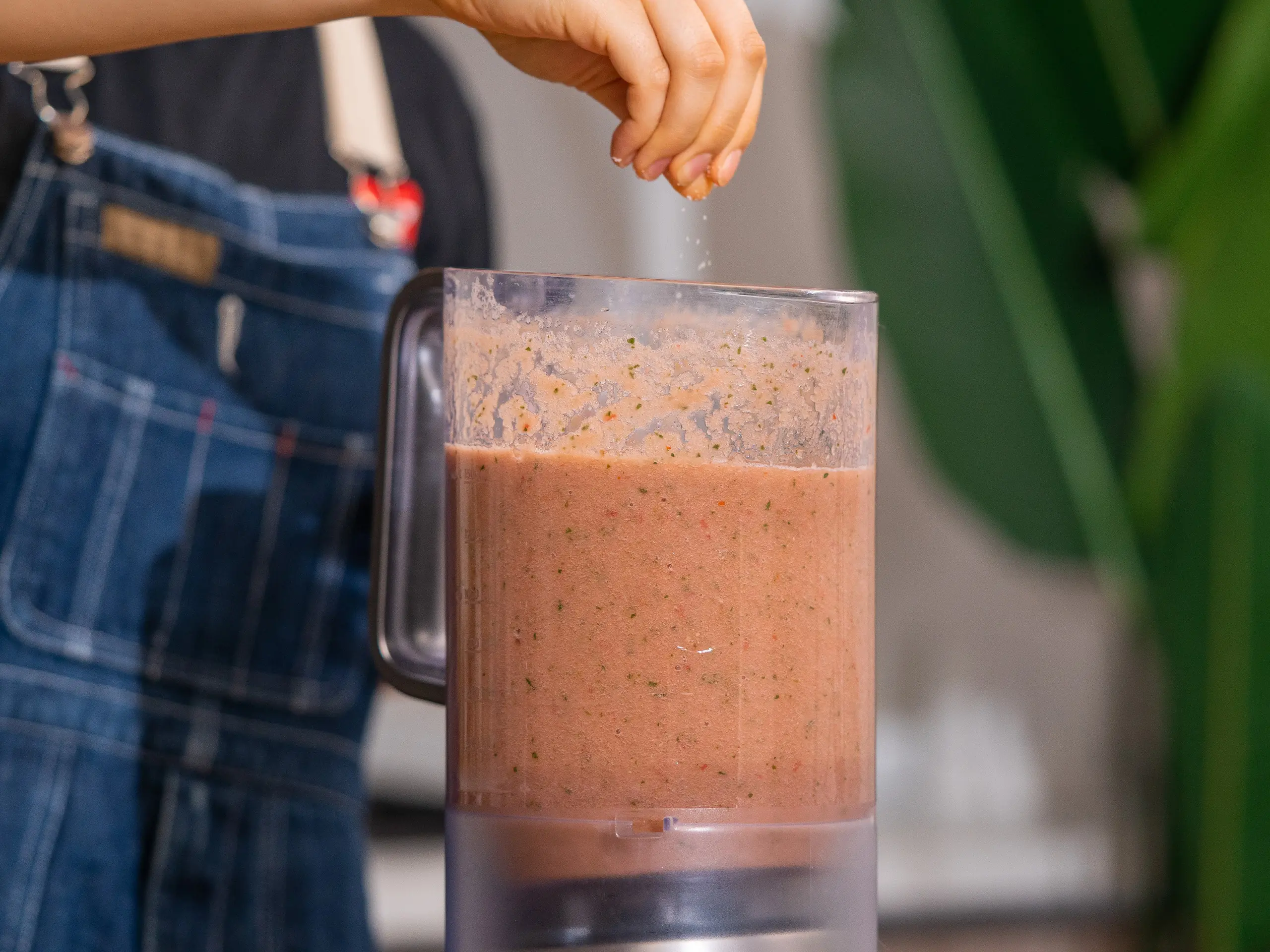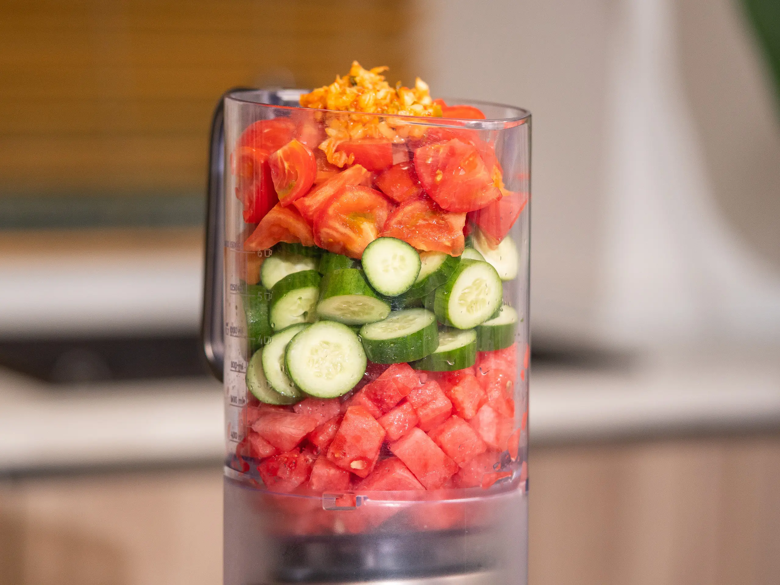 In a blender, add Watermelons (4 cups), Persian Cucumbers (4), Tomatoes (2), and Kimchi (1/2 cup). Blend until smooth.