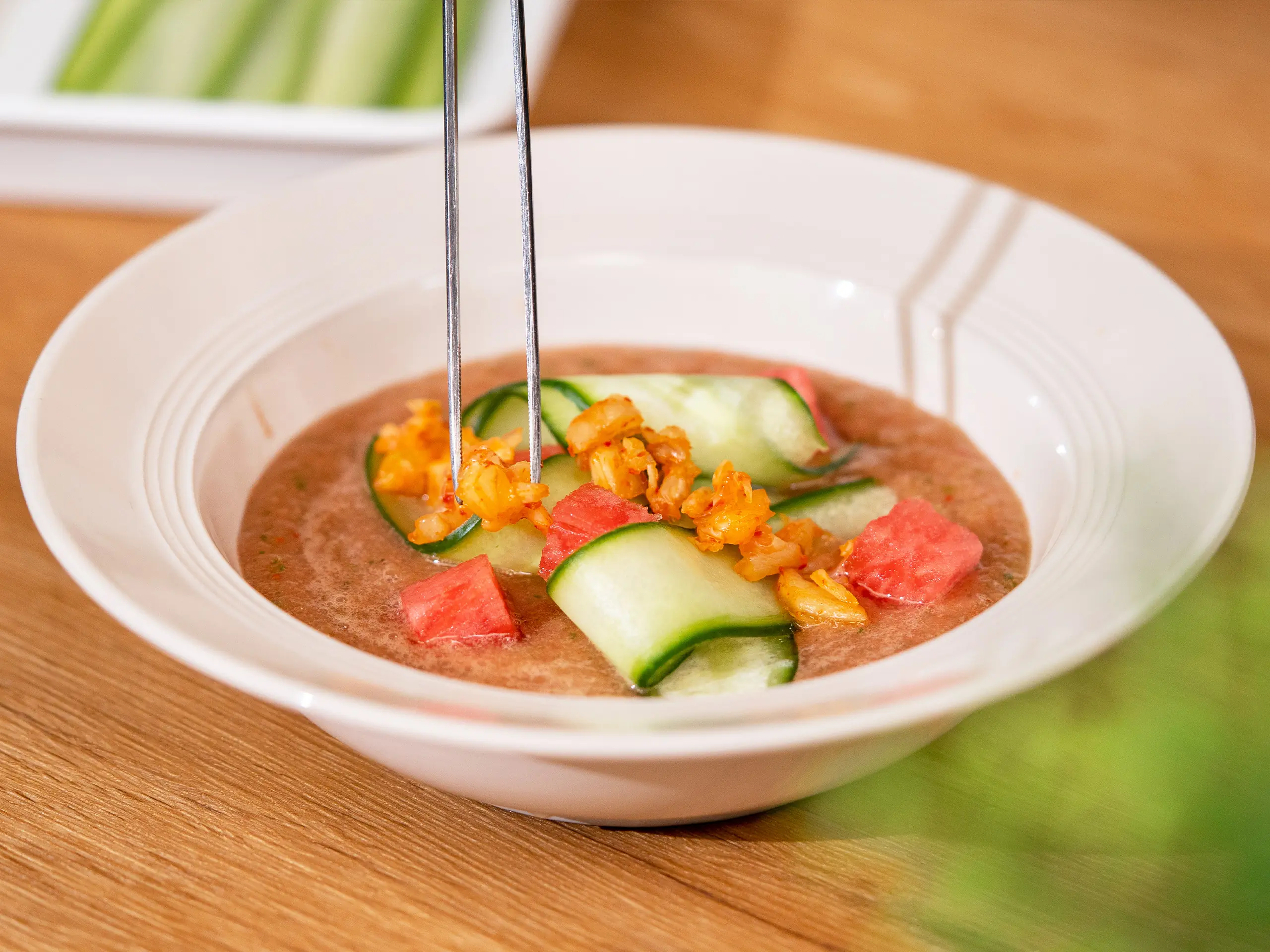 This Kimchi Melon Gazpacho recipe is all about a fusion of west and east flavors. The sweetness of the watermelon is complemented wonderfully in this version by kimchi, bringing a savory, salty, pickled punch to this light and refreshing cold soup, perfect for a hot summer day.