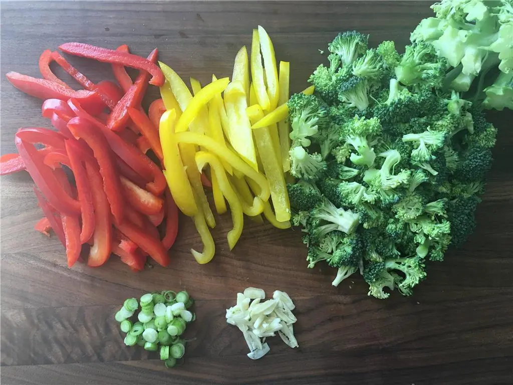 While the rice is cooking, slice the Bell Peppers (2) and Garlic (3 cloves). Chop the Broccoli (1 head) into florets. Thinly slice the white part of the Scallion (1 bunch) and set them aside for garnish later.