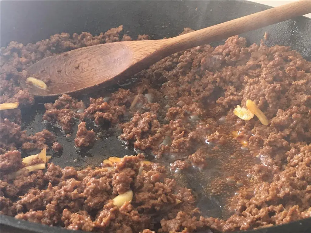 In a skillet over medium heat, cook the beef until browned. Make sure to break it up as it browns.