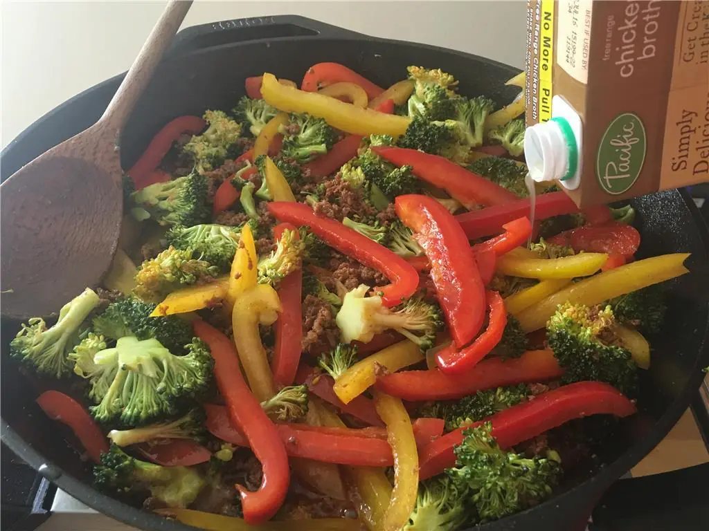 Once the meat has browned, add in the chopped vegetables and a bit of Chicken Stock (1 splash) and simmer for about 10 minutes.