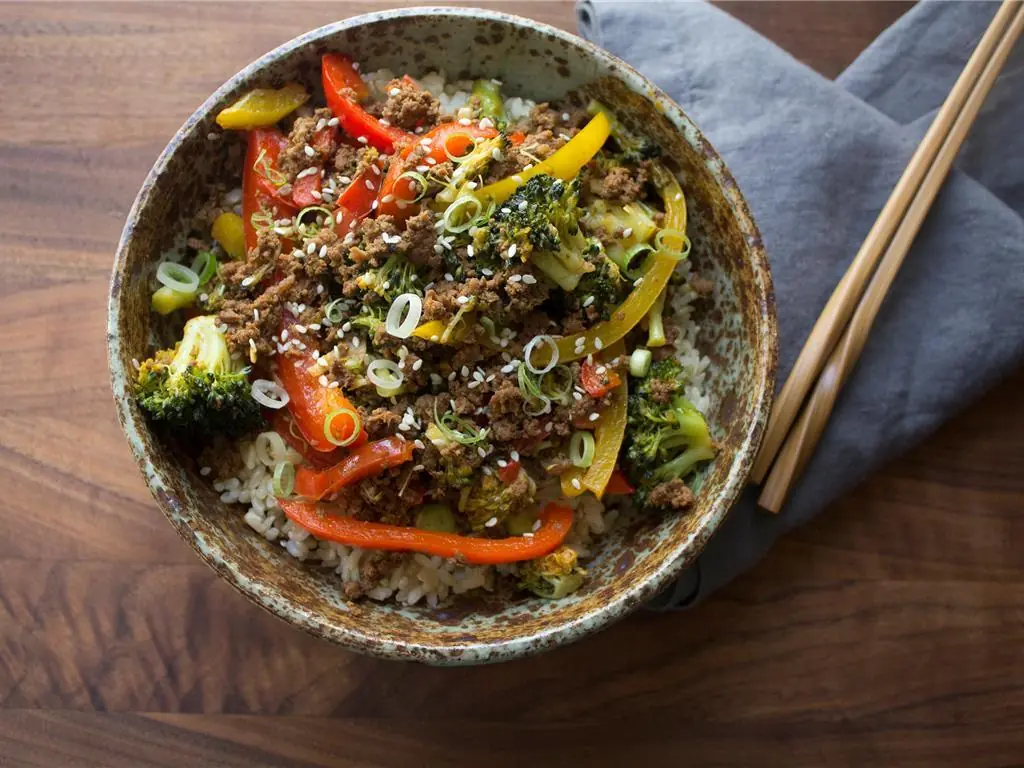 Put cooked brown rice in a bowl, top with beef and veggie mixture. Sprinkle with Sesame Seeds (to taste) and sliced scallions. Enjoy!