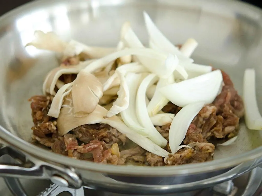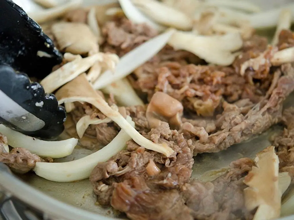 Heat a skillet over the medium-high heat, add some of the beef (you may need to cook 2-3 batches to cook it evenly), onion, and mushroom.