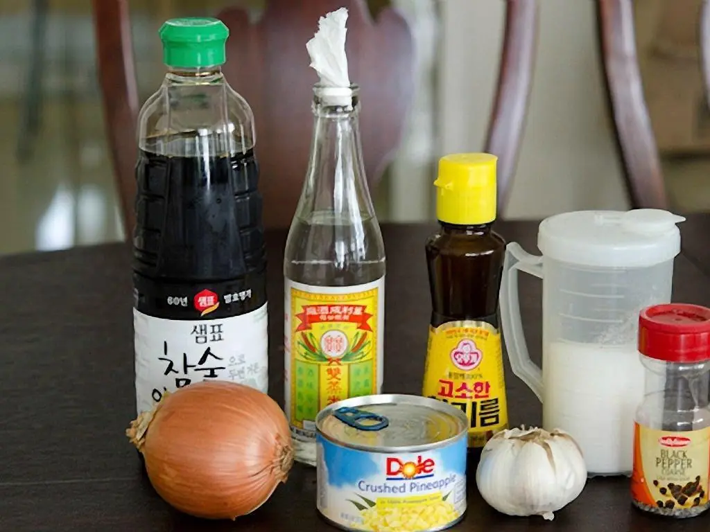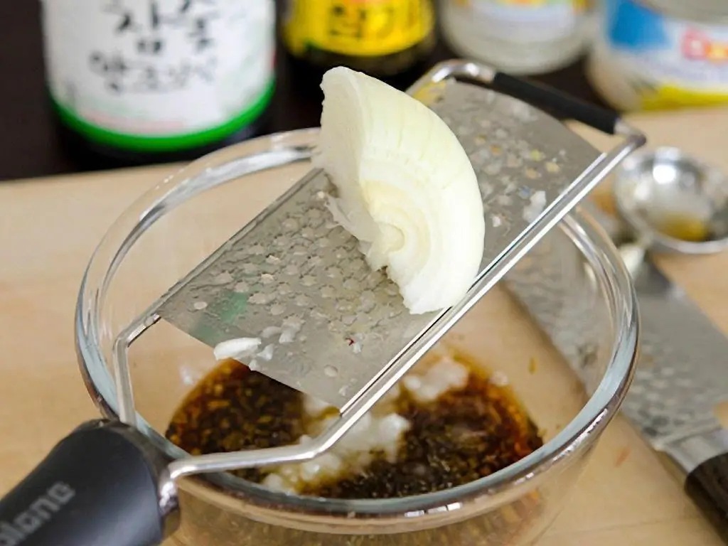 In a small mixing bowl, combine Low-Sodium Soy Sauce (1/3 cup) Granulated Sugar (3 Tbsp) minced garlic cloves (2), grated onion, and Rice Wine (1 Tbsp).