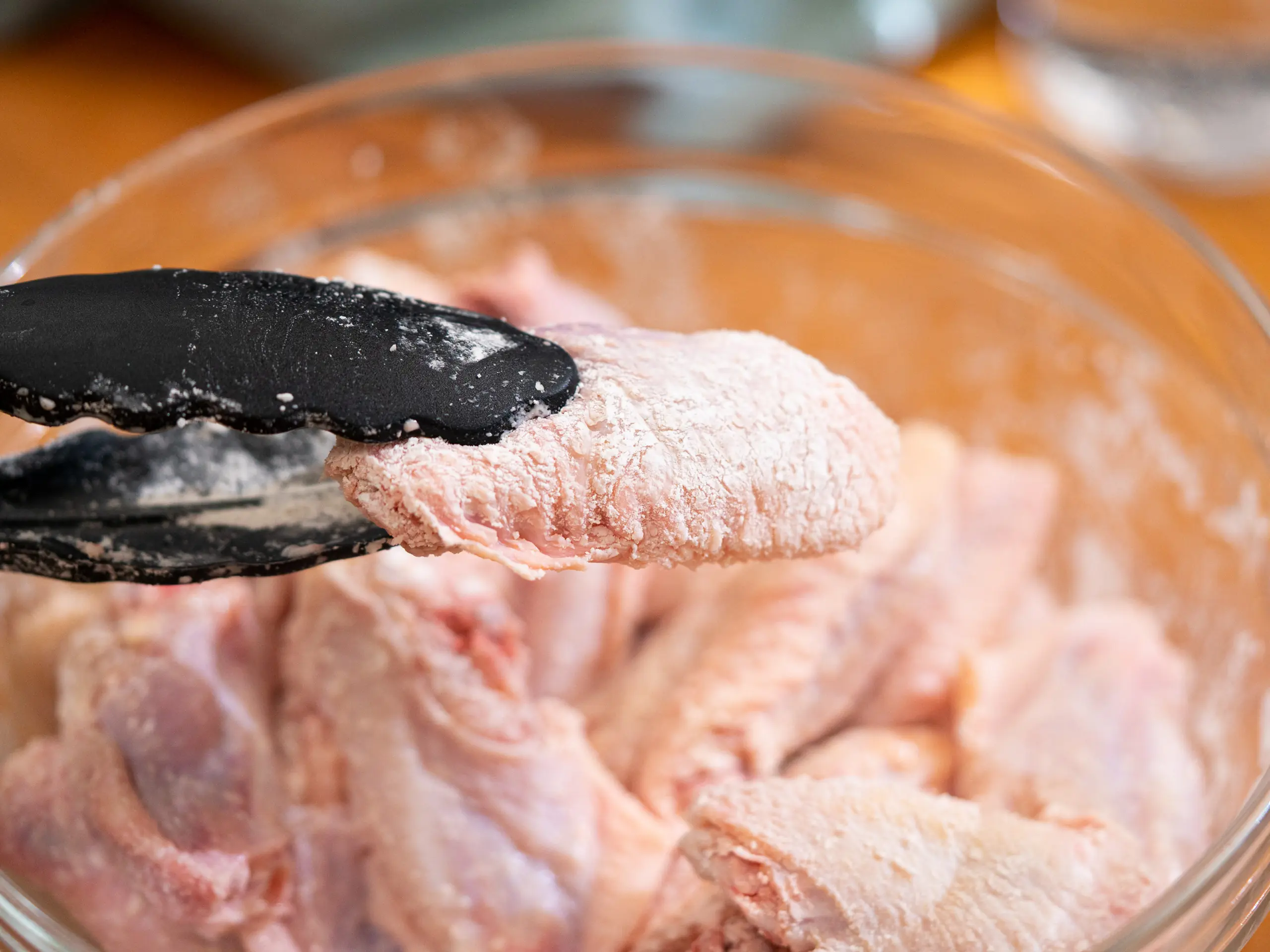 In a large bowl, combine Corn Starch (4 Tbsp), Kosher Salt (2 tsp), and Baking Powder (1/2 tsp). Add the Chicken Wings (2 lb) and toss to coat. Shake off any extra seasoning and transfer to a tray. Let it sit in the fridge uncovered for 30 minutes (up to overnight).