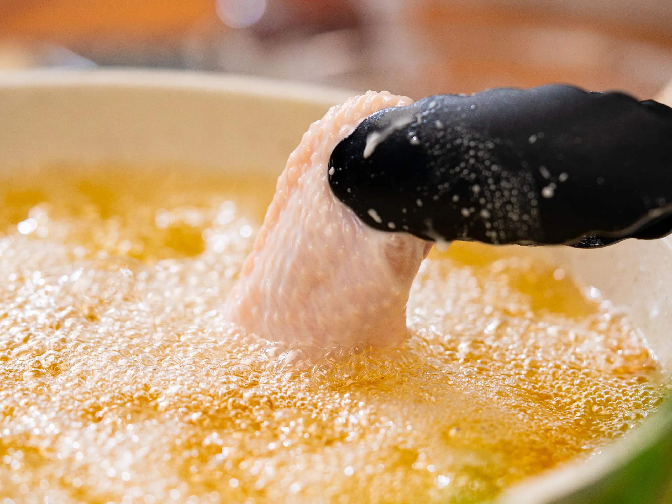 Whisk the batter to remix and add half the wings, tossing to coat. One by one, let the extra batter drizzle off the wings and place into the hot oil. Repeat until you have a single layer across the bottom of the pot. Cook for 6-7 minutes or until they turn a light golden brown - they will stick to the bottom at first, just let them cook for 30 seconds before trying to move them, and they should come up effortlessly.