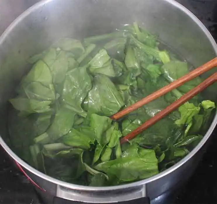 Bring a pot of Water (3 1/3 cups) and half a teaspoon of the Salt (1/2 tsp) to a boil and cook the spinach for 2 minutes.