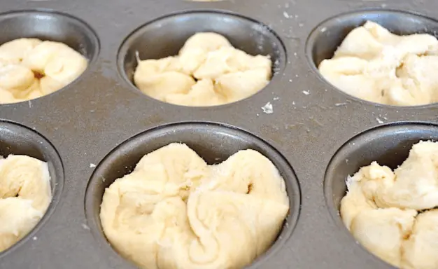 Put a square of dough into each well. Bring the corners of the square into the center so that each of the kouign amann look like little four leaf clovers. Sprinkle the tops generously with more granulated sugar. Put the tin aside to rise for another 30 minutes.