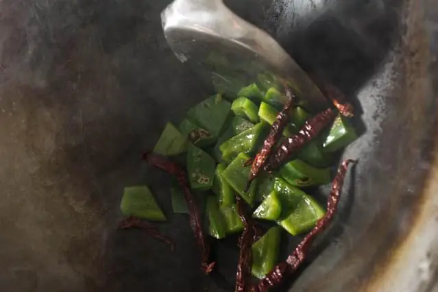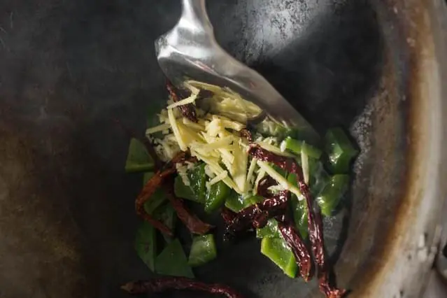 In a wok over medium heat, heat the Peanut Oil (2 Tbsp). Add the Dried Chili Peppers (8) and Green Bell Pepper (1) and stir-fry slowly, allowing the skin of the bell pepper to blister.