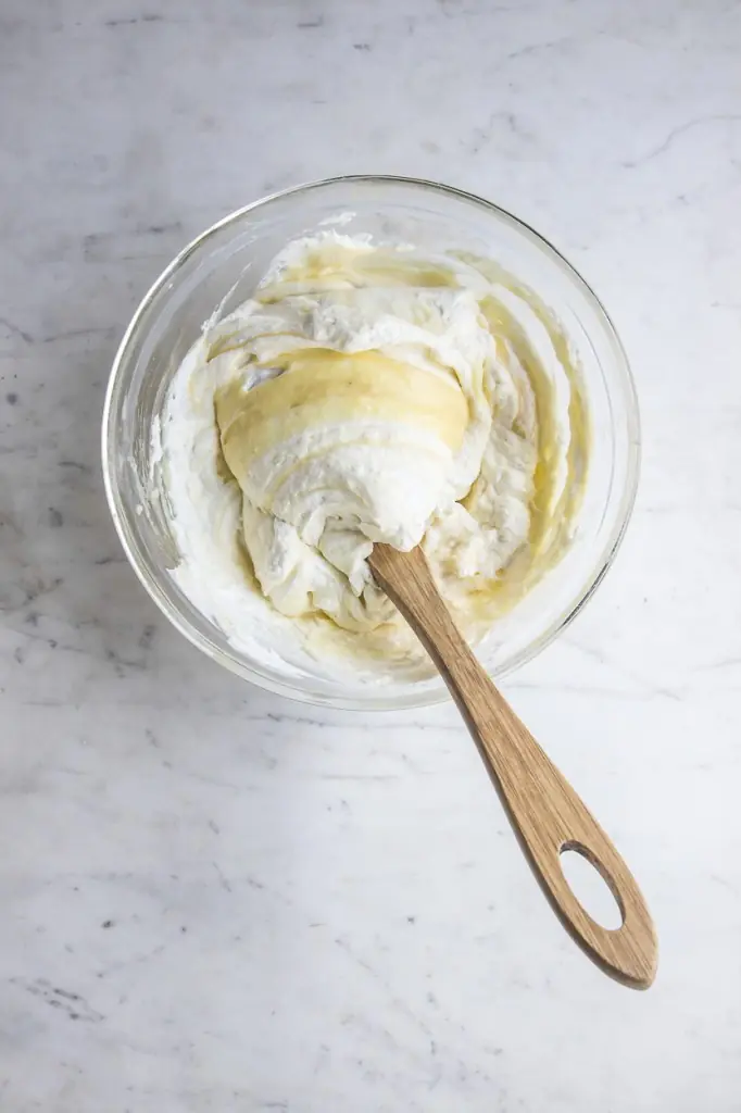 To assemble the cake, whip Heavy Cream (1 cup) until medium soft peaks and fold whipped cream into the chilled lemon curd.