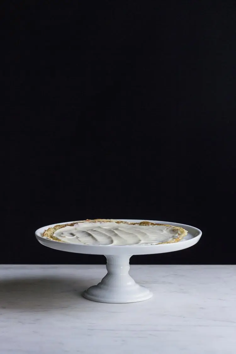 Spread a bit of the filling onto the plate or cake stand that you will be building the crepe cake on and lay the first crepe on top of it. This acts like glue to keep the base of the crepe cake from moving.