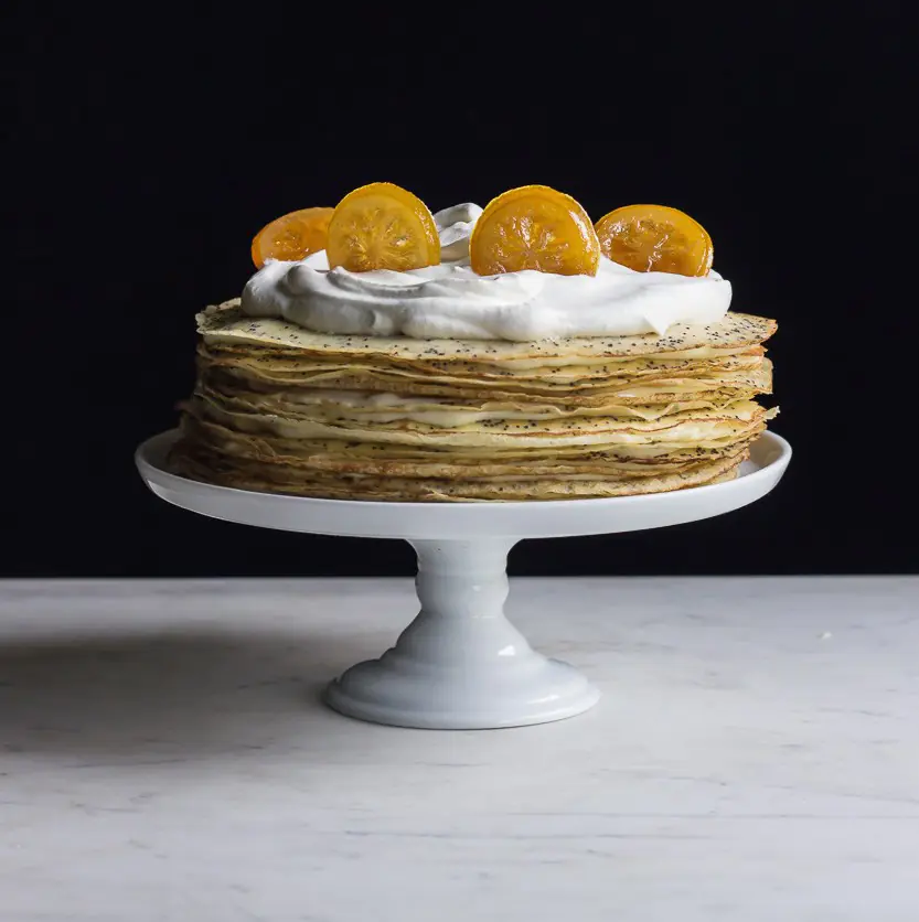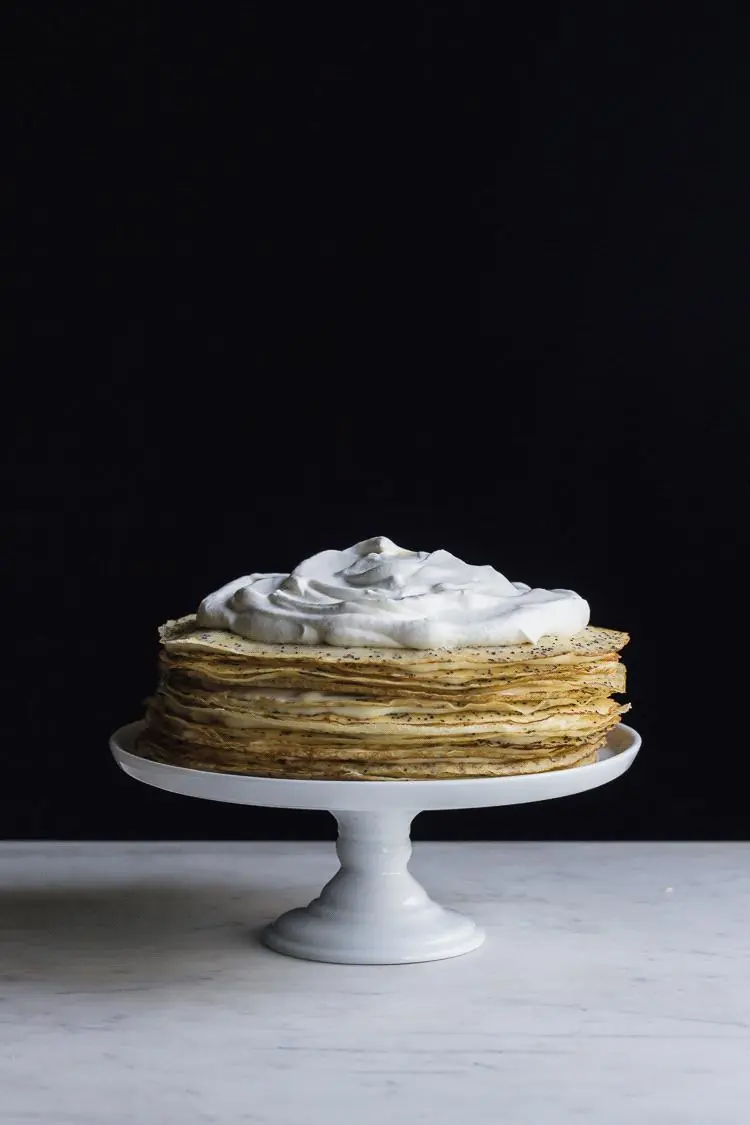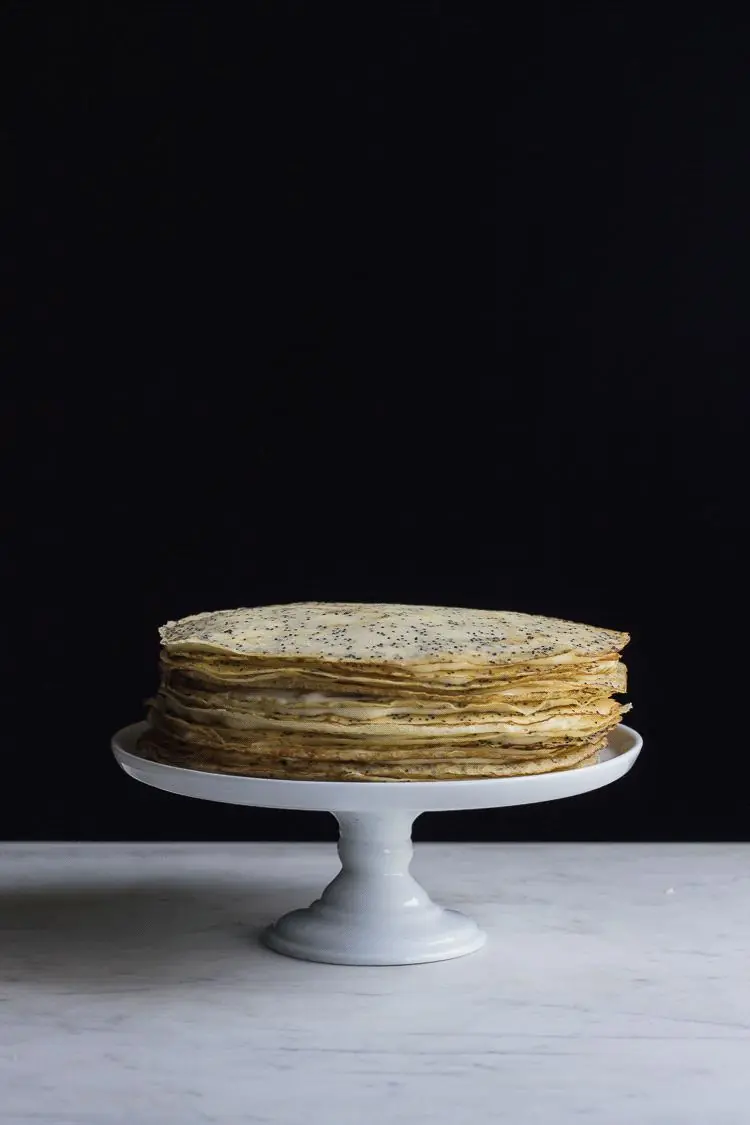 If you are not familiar with crepe cakes, they are comprised of layer upon layer of crepes spread with filling between each crepe. The brightness of the lemon combined with the distinct flavor of poppy seeds is culinary perfection and makes for a spectacular crepe cake.