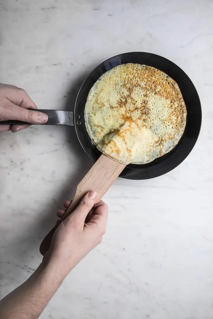 Cook the crepe for approximately 1 1/2 to 2 minutes and then flip and cook for another 60 seconds.