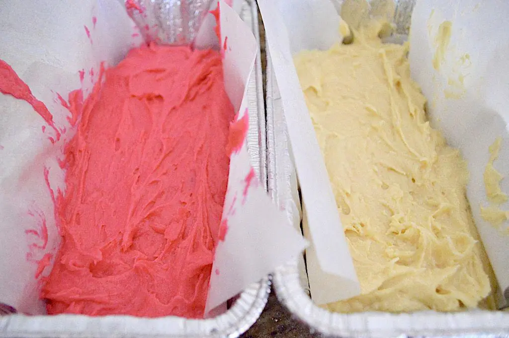 Transfer them each into their own prepared loaf pans, place the loaf pans on a sheet tray to make taking them in and out easier and bake them for about 45 minutes. Insert a toothpick in the center of each to make sure it comes out cleanly.