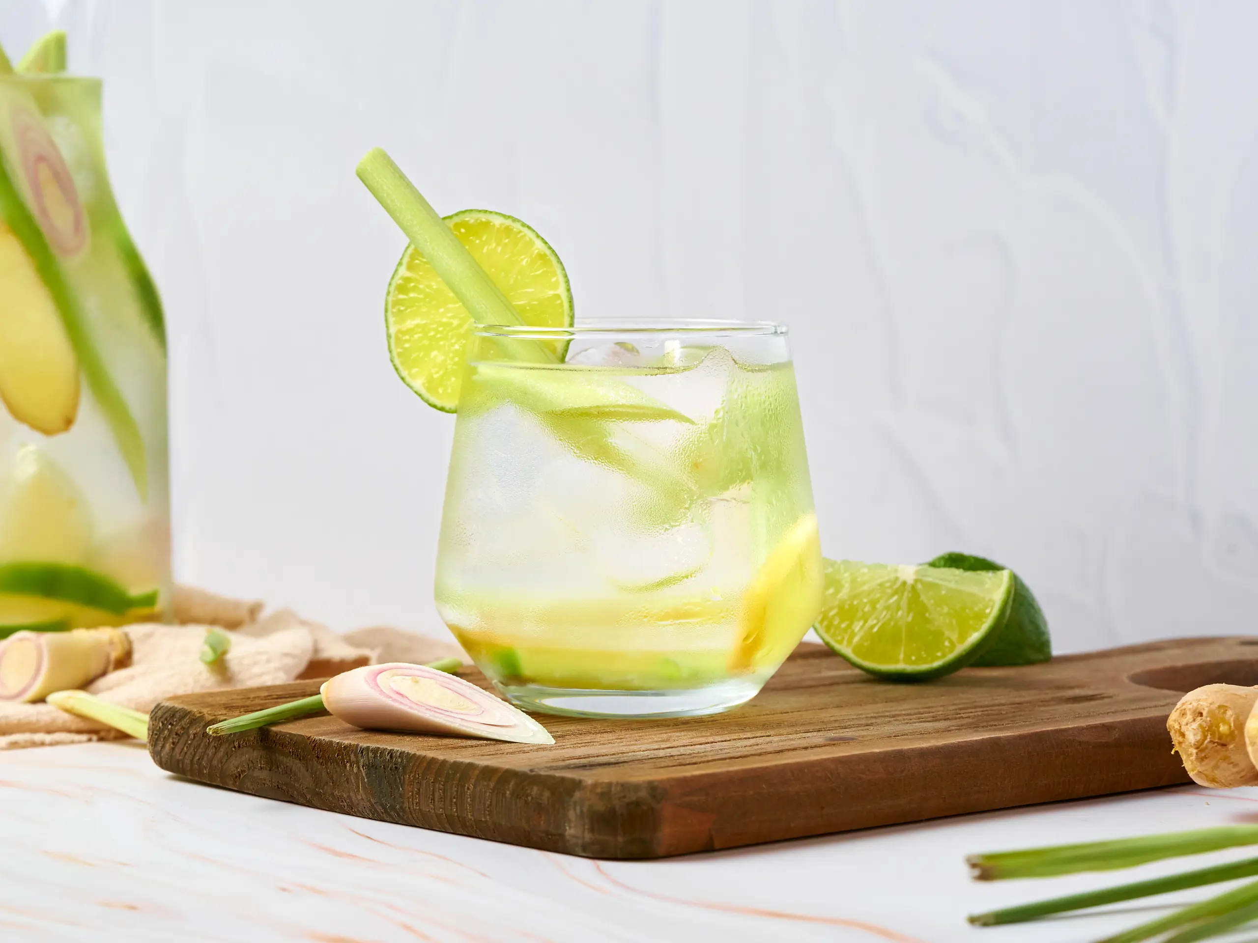 Add Fresh Ginger (1 piece), Water (to taste), and Limes (2) to a pitcher and fill with Lemongrass (2 stalks), stir well.