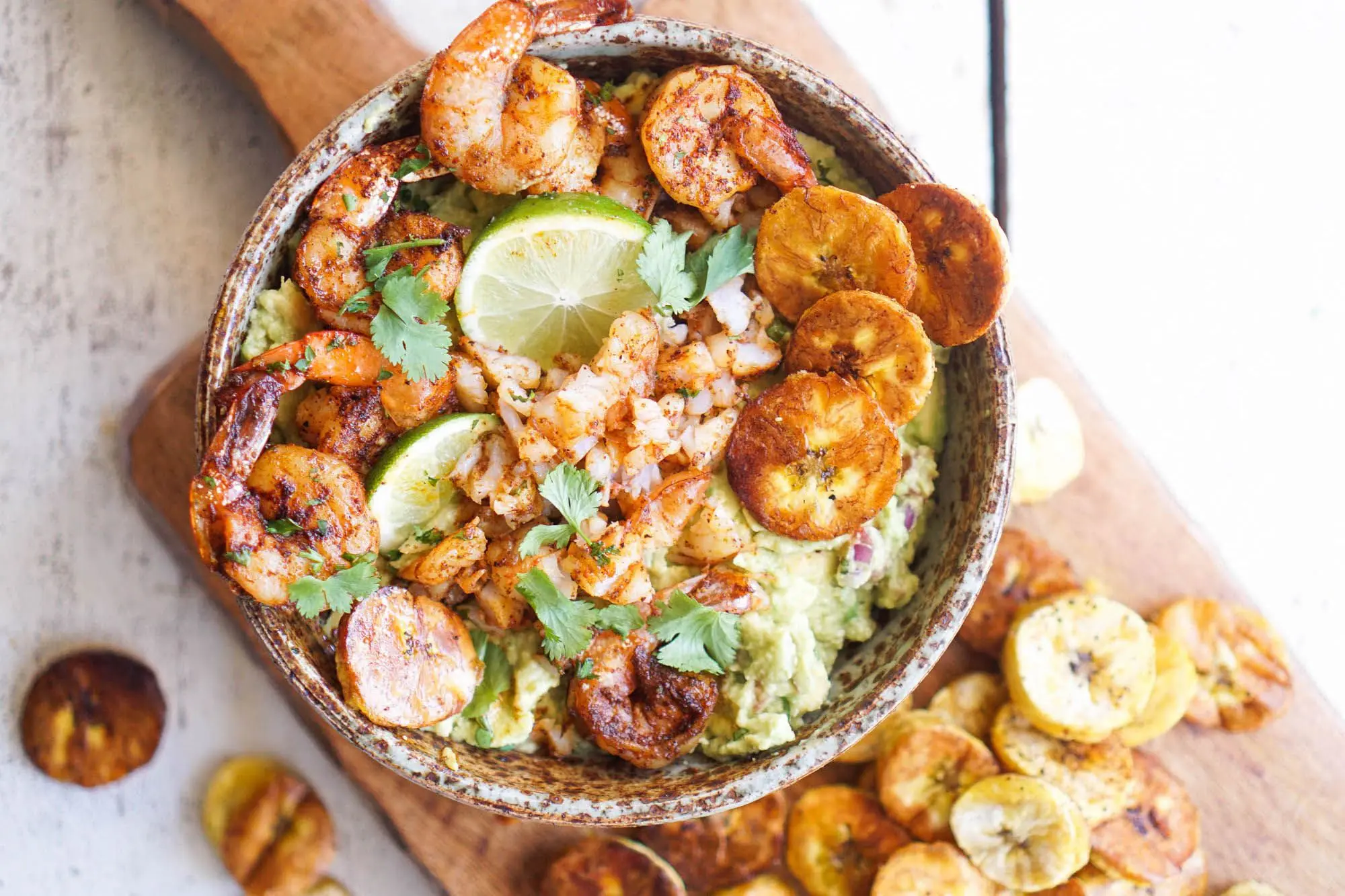 Flavorful guacamole loaded with chopped chili shrimp and served with roasted plantains. An easy, crowd pleasing, Whole30 compliant appetizer.