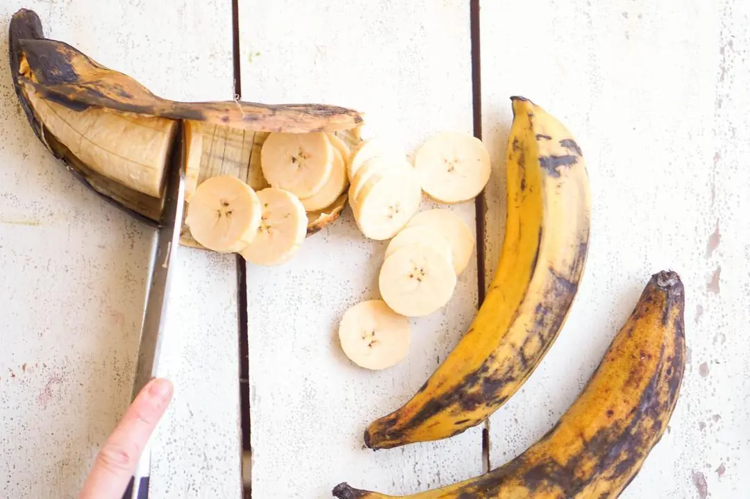Peel and slice the Plantains (3) into rounds, add to the baking sheet and toss to coat in the oil.