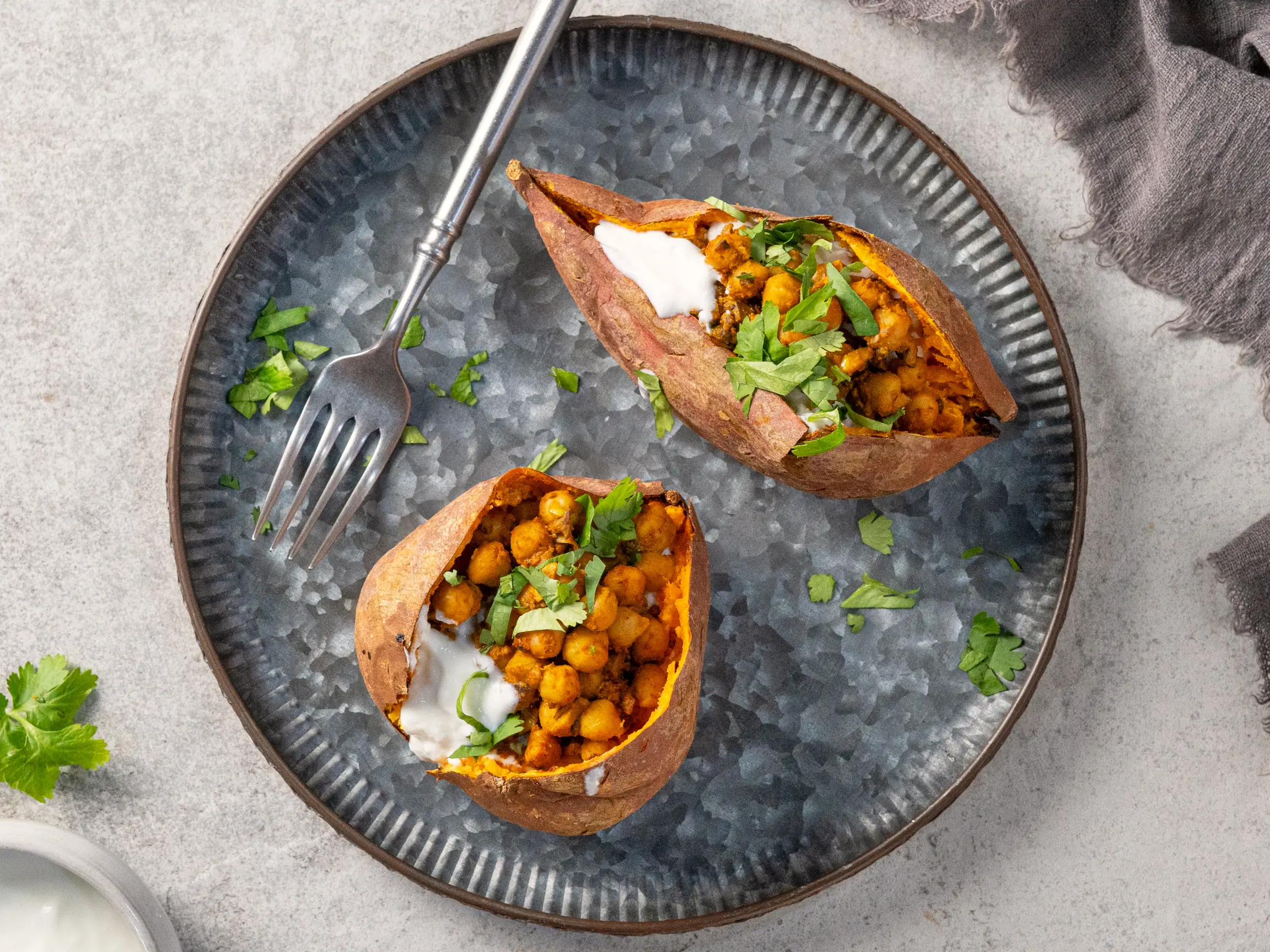 Top each sweet potato with Unsweetened Coconut Yogurt (4 Tbsp), curried chickpea, and Fresh Cilantro (1 stalk) and serve.