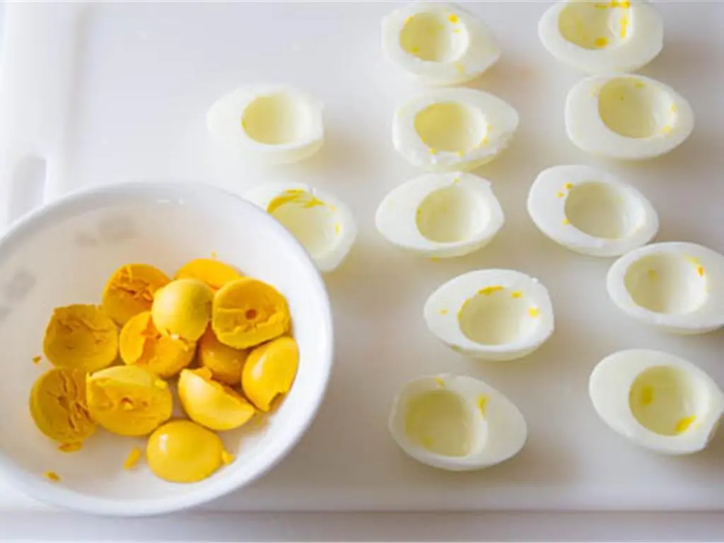 Then peel the eggs, cut in half and separate the egg yolks.