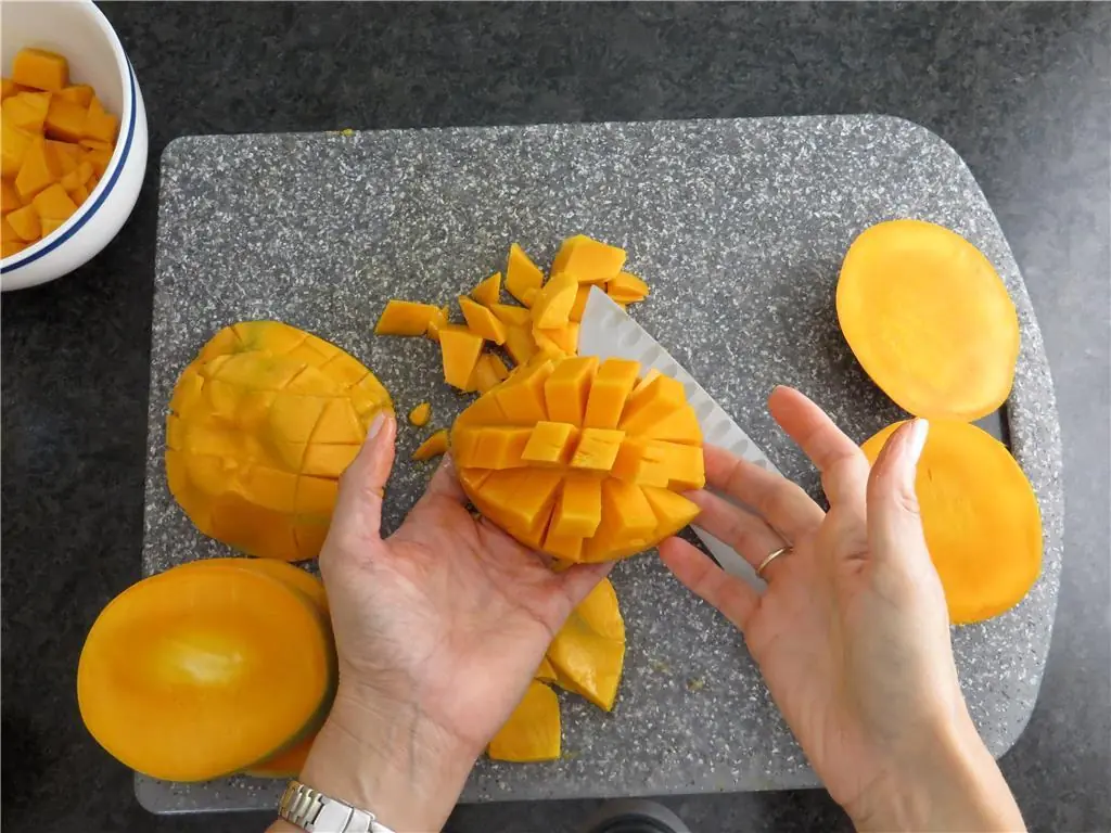 With a sharp knife, slice the mangoes vertically along either side of the pit, so you have two disc shaped slices. Score the mango flesh in a diamond pattern, and push the skin side out to expose the flesh. Slice flesh away from skin.