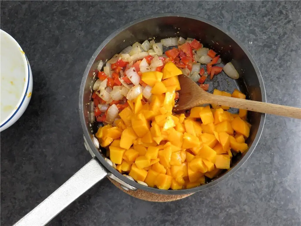 In a saute pan, heat the Vegetable Oil (1 1/2 Tbsp) and Crushed Red Pepper Flakes (1/2 tsp). Add the onions, and sweat until soft. Add the ginger and red bell pepper. Saute for 1-2 minutes. Add mangoes and cook 1 minute longer.