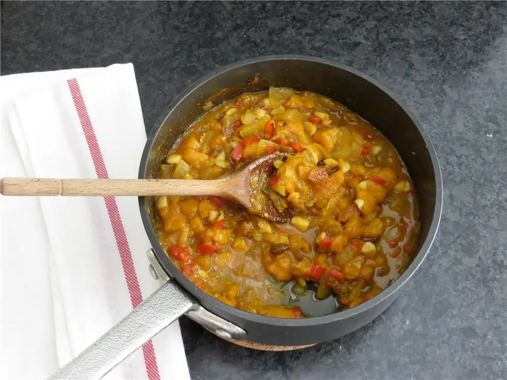 In a small bowl, combine Pineapple Juice (1/2 cup), Apple Cider Vinegar (4 Tbsp), Brown Sugar (4 Tbsp), and Sweet Curry Powder (2 tsp). Add to the pan, and stir to combine. Bring mixture to a low simmer, and let reduce for 30 minutes.