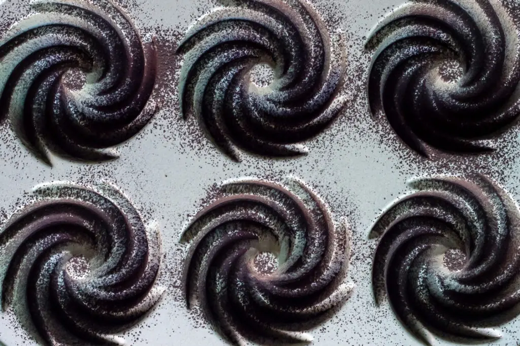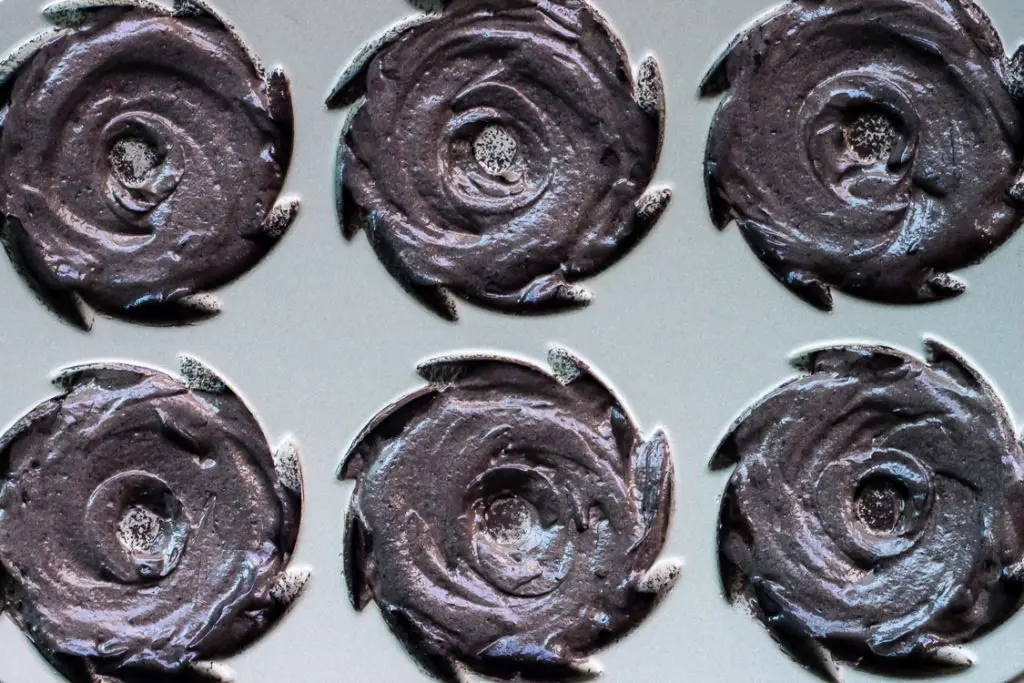 Spoon batter evenly into the wells of the prepared bundt cake pan and bake for 20 minutes.
