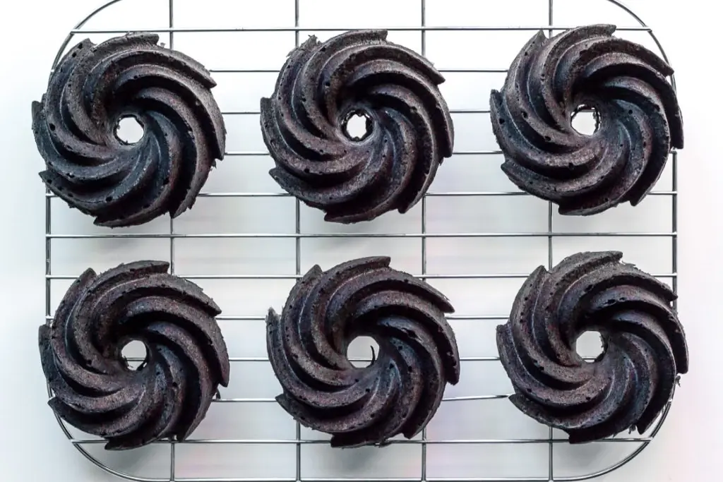 Place the rack with the black sesame bundt cakes over a piece of parchment paper and pour glaze over the cooled cakes.