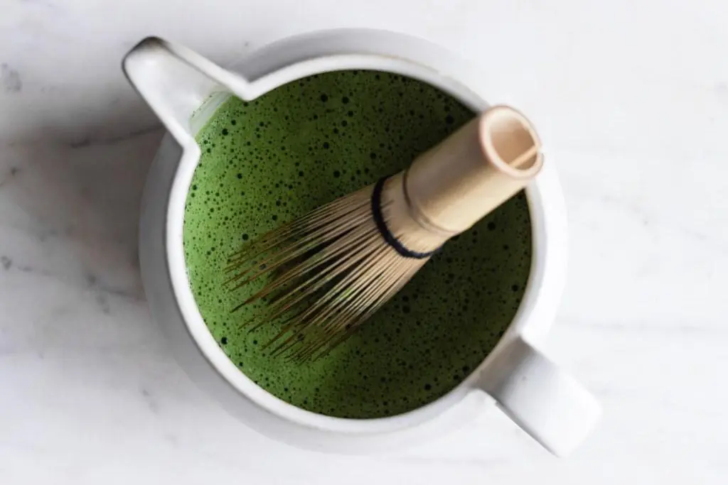 Pour Water (2 fl oz) over the matcha, and use a bamboo whisk in a zigzag motion to whisk the matcha until smooth and frothy, approximately 10-15 seconds.