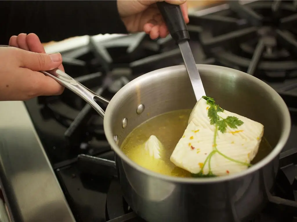 Pat Halibut Fillets (2) dry with paper towels. Add fish to the simmering pot and cook for five minutes until cooked through.