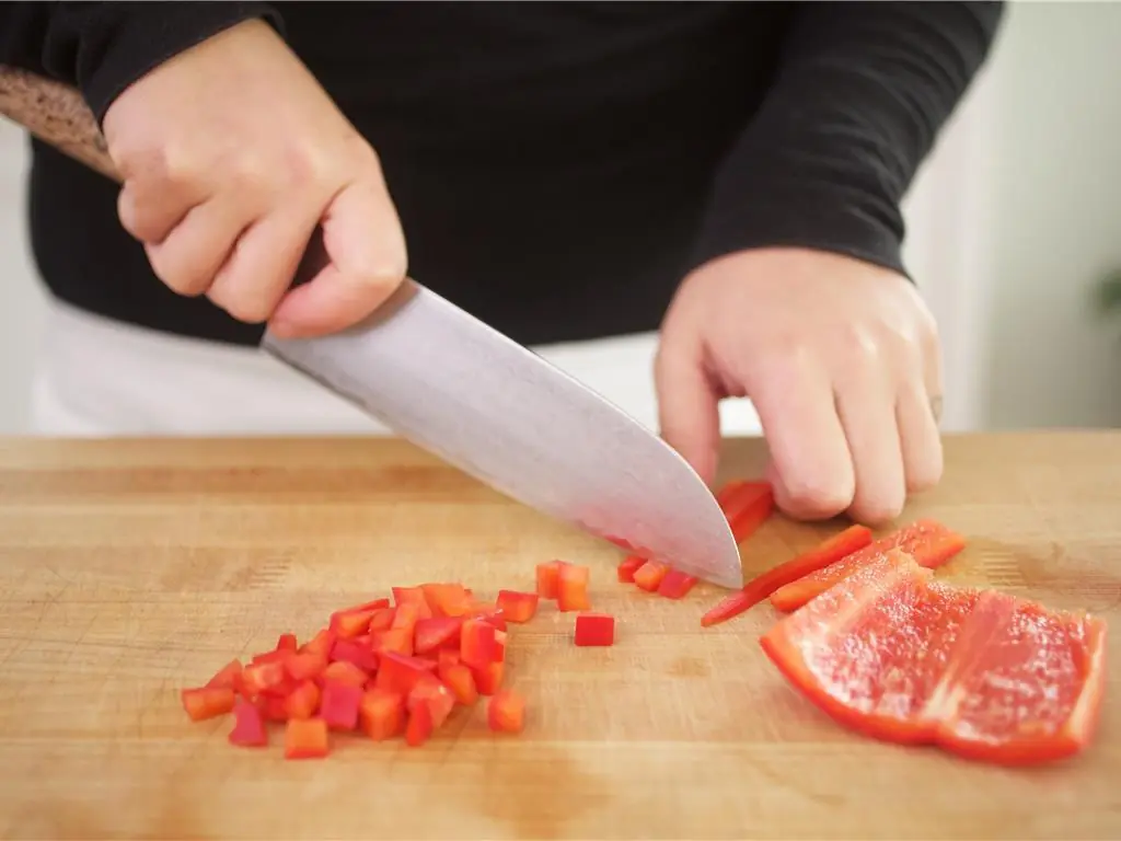 Discard the stem, seeds, and pith of the Red Bell Pepper (1/2). Slice into small quarter inch pieces, and add to medium bowl. Thinly slice Scallion (1 bunch), across, and add to medium bowl.