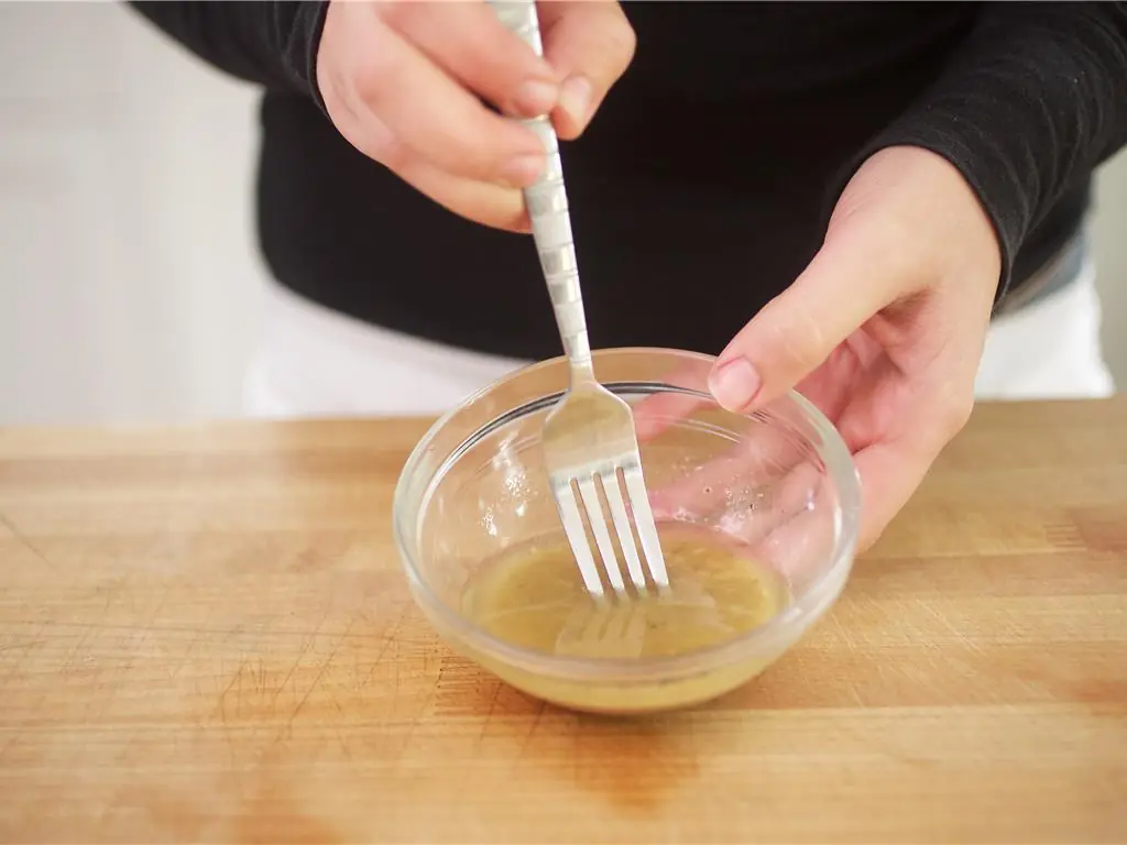 Finely mince Ground Black Pepper (1/4 tsp) into a paste like consistency and place in a second small bowl. Add the Olive Oil (3 Tbsp), chopped garlic, and Red Wine Vinegar (1 Tbsp). Slowly pour in Anchovies (2) while whisking with a fork until emulsified.