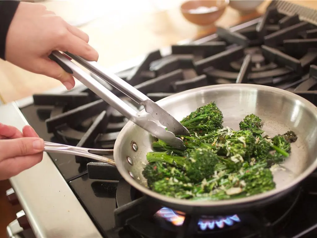 Heat two tablespoons of olive oil in a large saute pan over medium heat. Place the Broccolini (1 3/4 cups), Salt (1/4 tsp), and Black Pepper (1/4 teaspoon), and cook for four to five minutes.