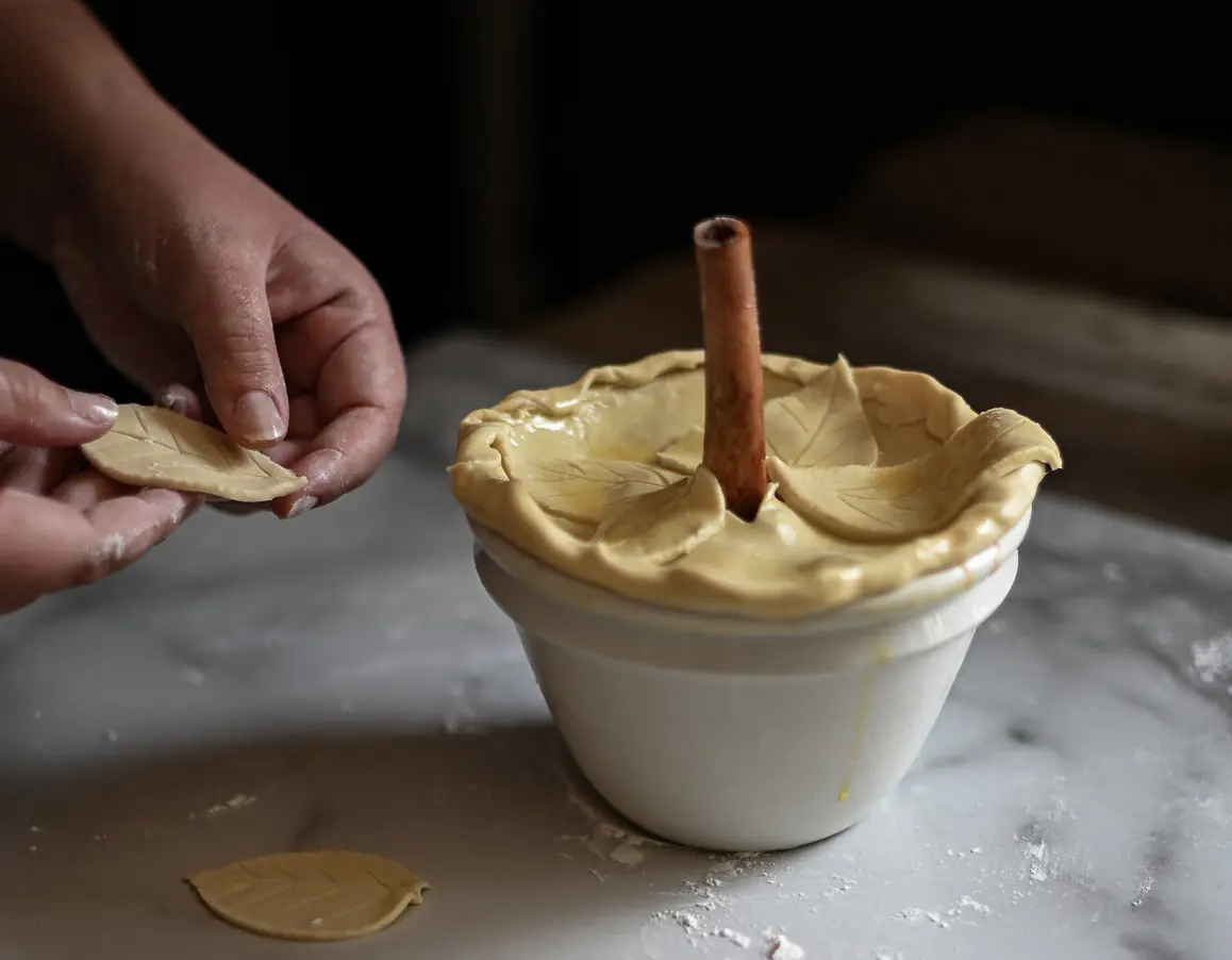 Carefully drape the pastry over each pie, slicing off any excess around the edges. Crimp in the cut edges of the pastry and roll out any leftover scraps to decorate the pies with.