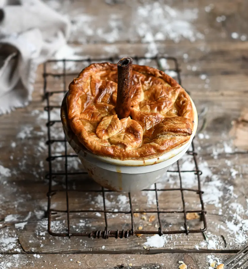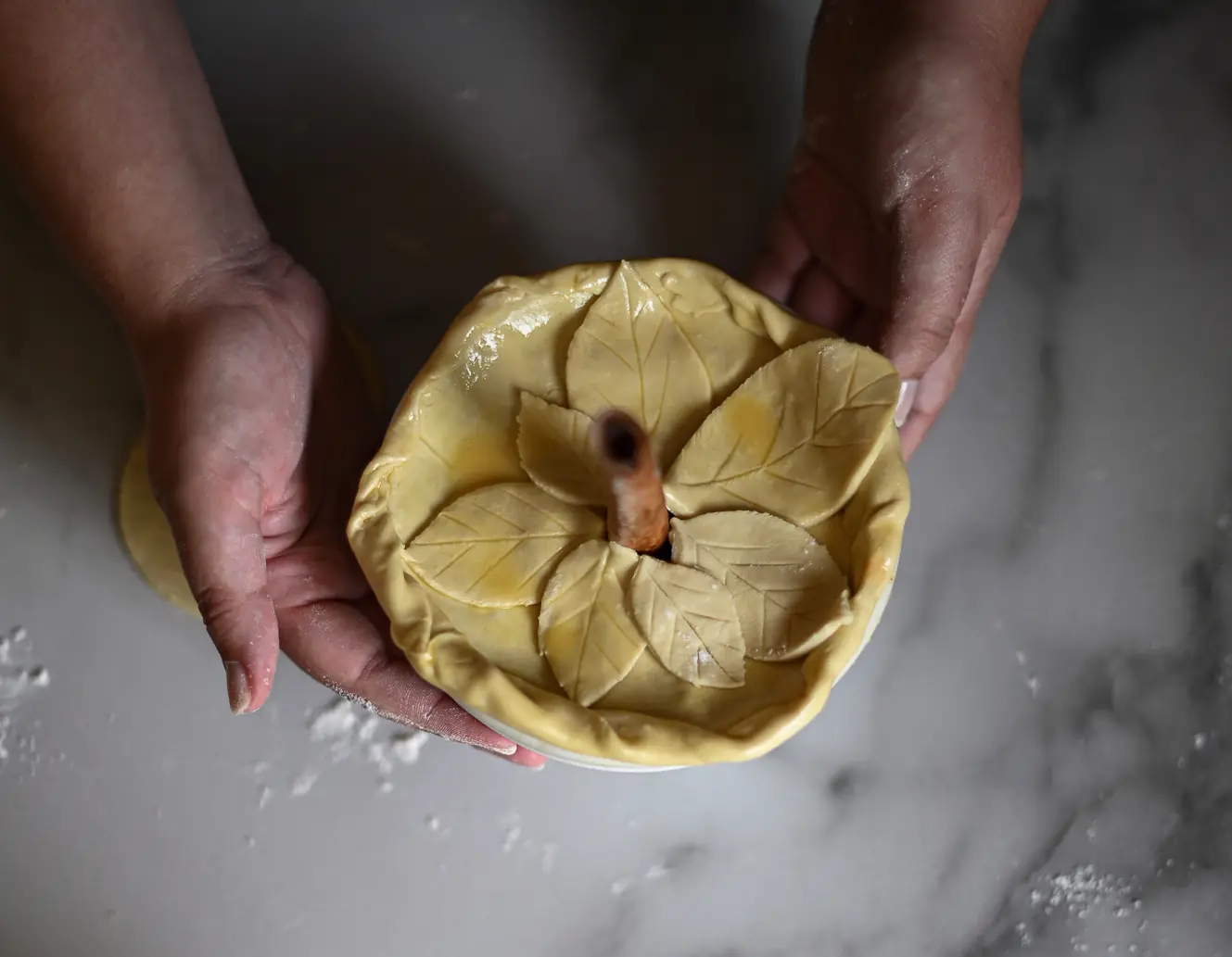 On a floured surface, roll out the Puff Pastry (1) and divide according to the number of pies being made. Slice a small “x” into the middle of each pastry sheet (this allows the shank bone to poke through the pastry).