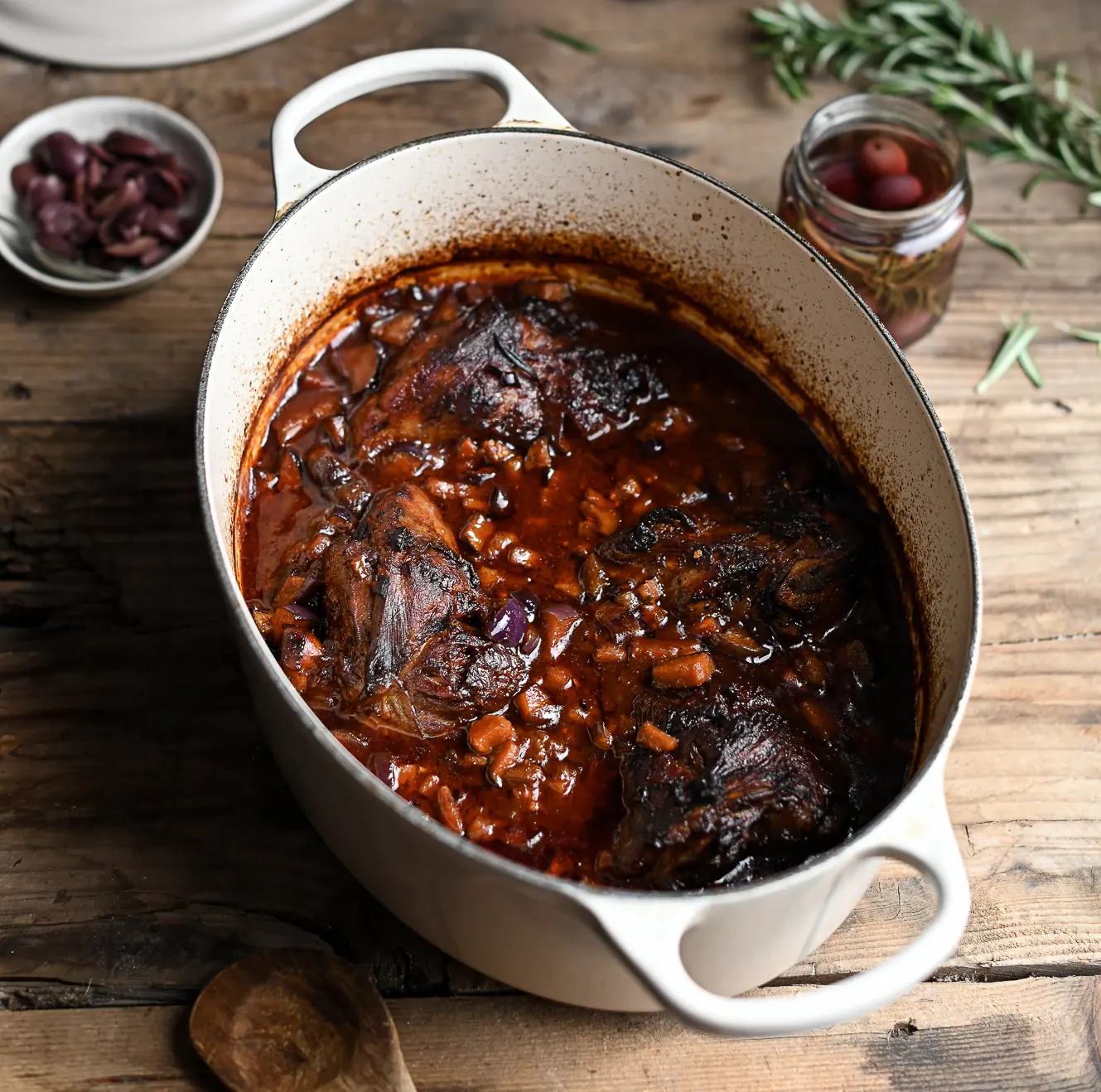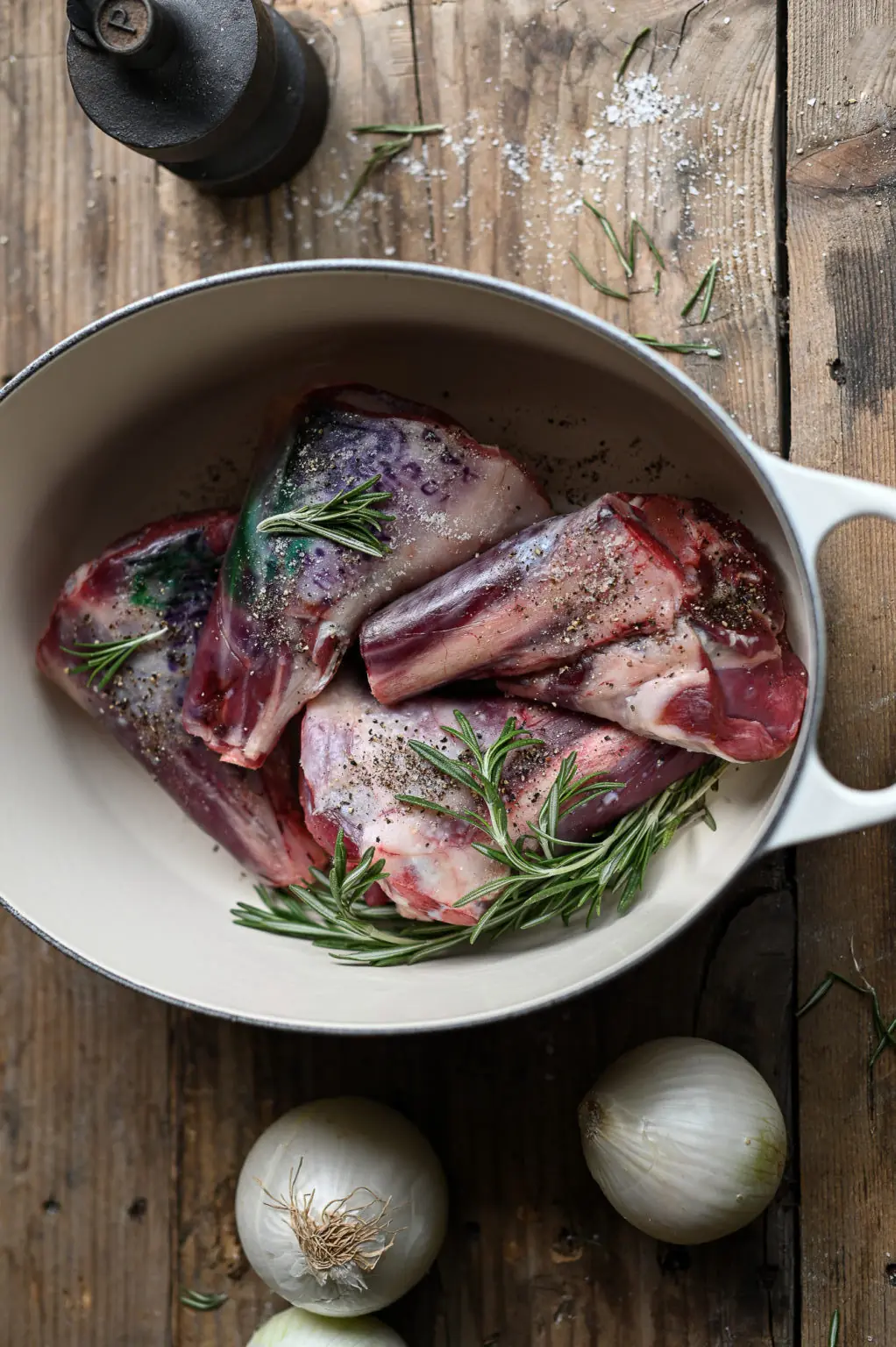 Pour in Chicken Stock (2 cups) and return the shanks to the pot. Bring to a simmer then cover the casserole with its lid and cook the shanks in the oven for 30 minutes.