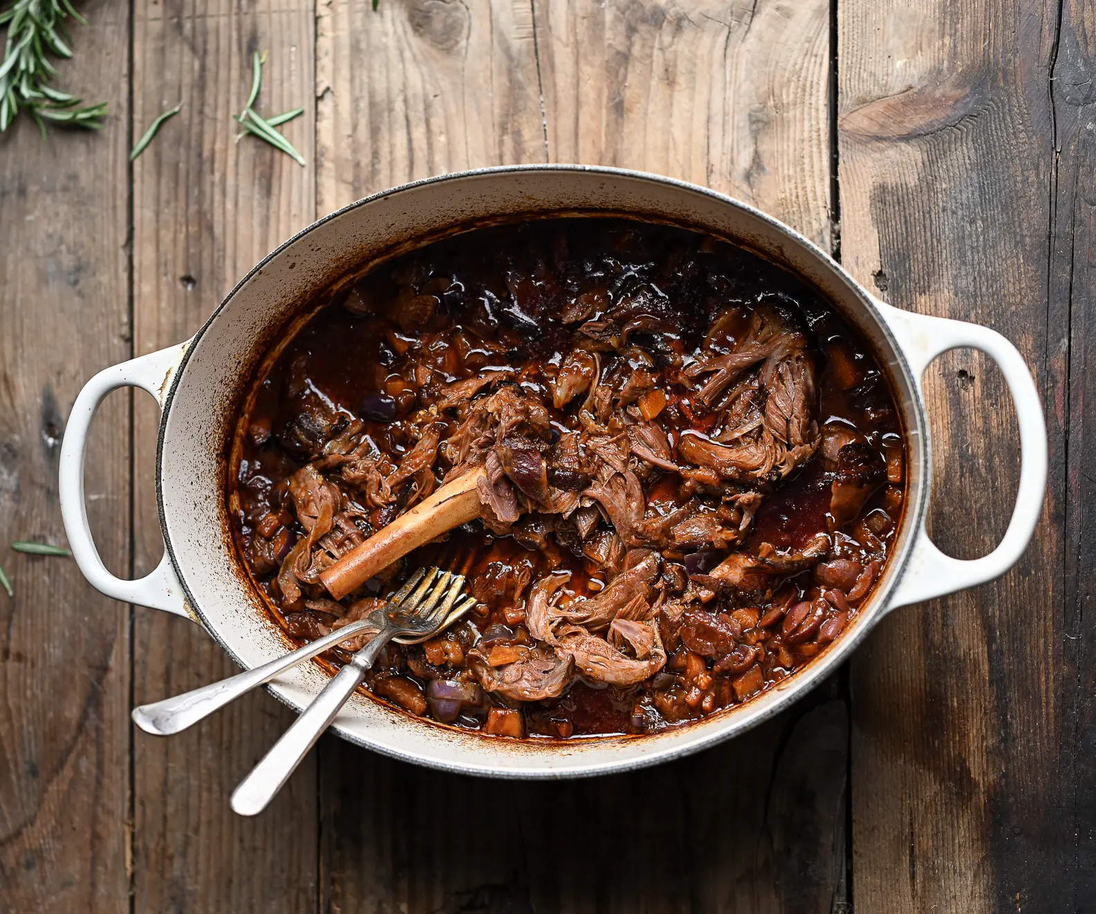Use two forks to shred the meat, removing any bones and setting them aside. Carefully stir through the Black Olives (2 Tbsp) and season the shredded lamb to taste.