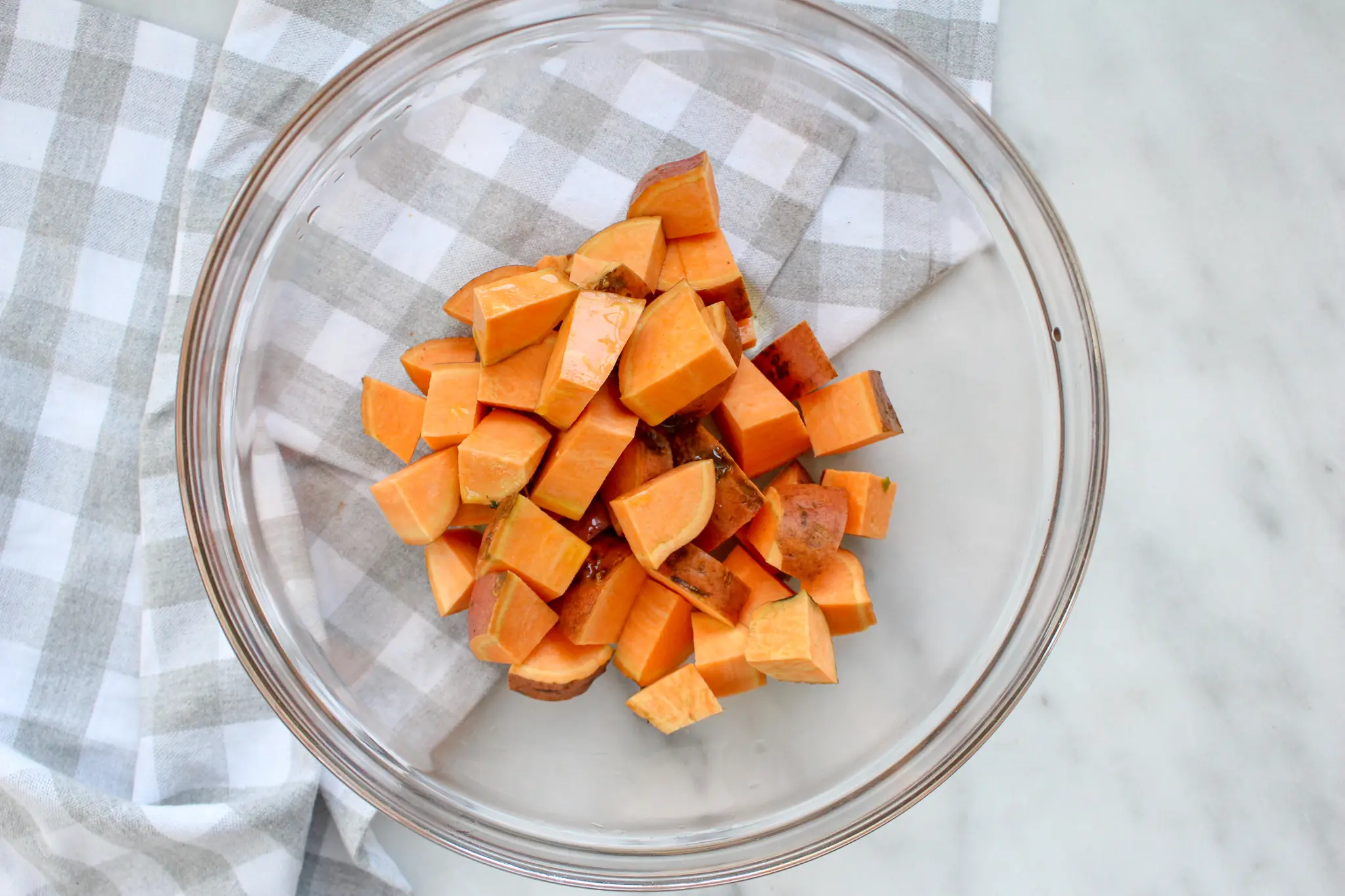 While sweet potatoes roast, toss Red Onion (1), Grape Tomatoes (2 cups), and Bell Pepper (1) with Olive Oil (1 tsp), Dried Oregano (1 tsp), Salt (to taste) and Ground Black Pepper (to taste).
