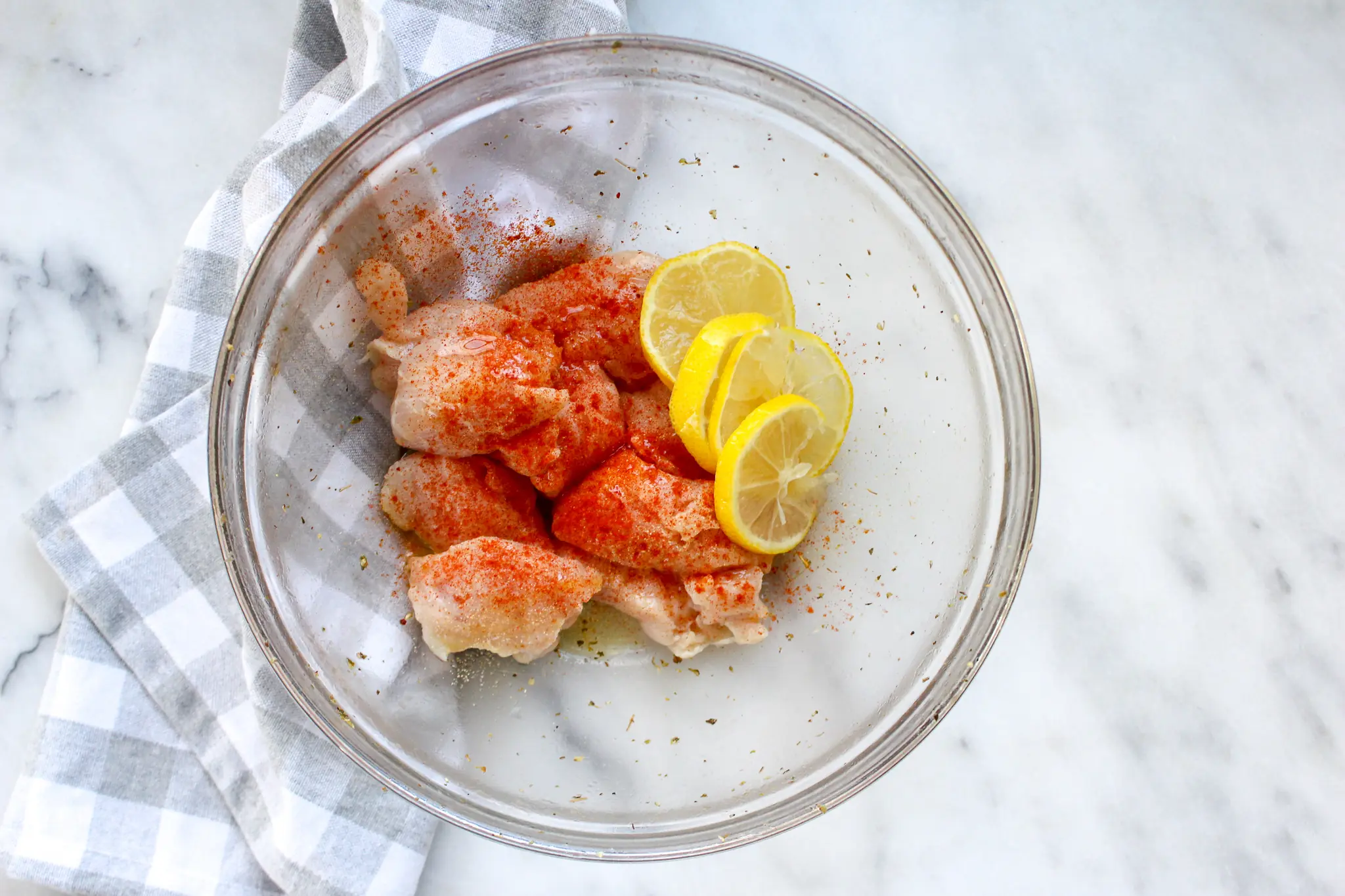 In a separate bowl, toss Chicken Breast (1 lb) with Lemon (1), Olive Oil (1 Tbsp), Dried Oregano (1 tsp), Simply Organic Garlic Powder (1/2 tsp), Smoked Paprika (1/4 tsp), Salt (to taste) and Ground Black Pepper (to taste).