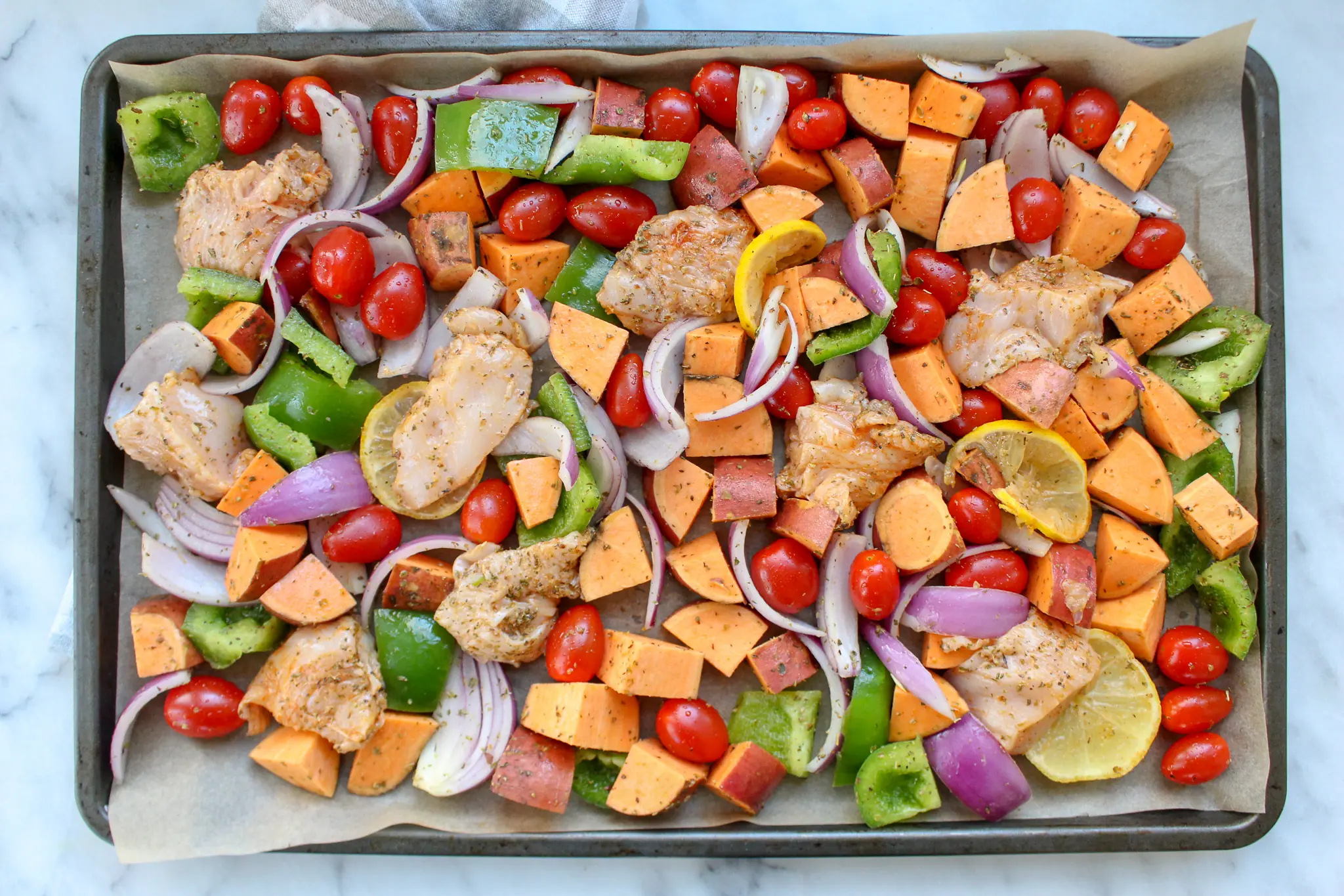 Add remaining veggies and chicken to the baking sheet after the first 20 minutes and continue cooking at 375 degrees F (190 degrees C) for 20 minutes, until the internal temperature of the chicken reaches 165 degrees F (75 degrees C) and the vegetables are soft to bite.