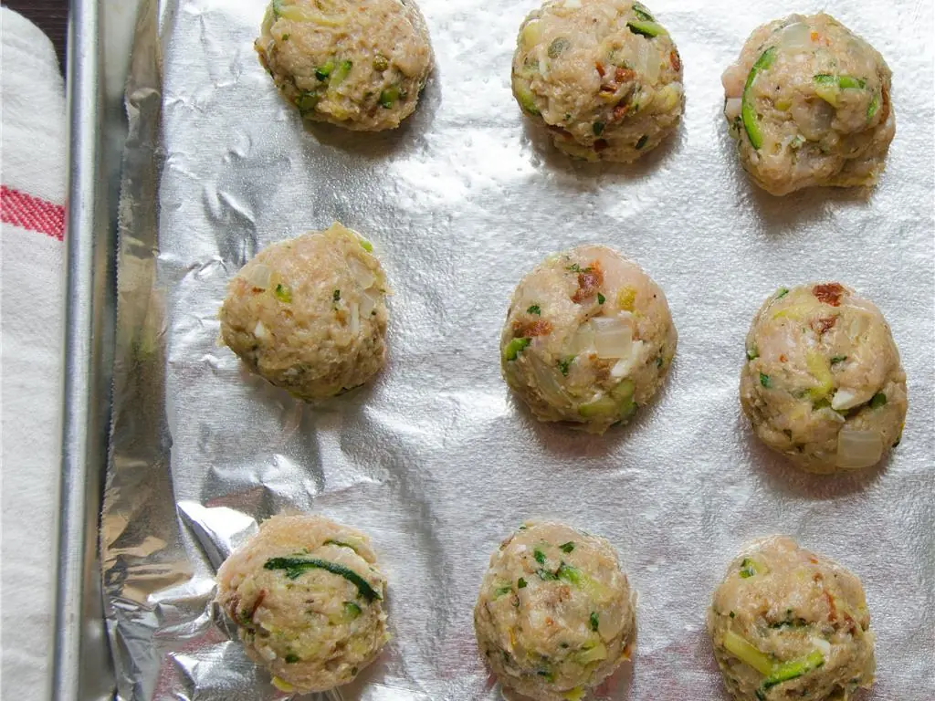 Scoop out a tablespoon of turkey mixture and roll it between your hands to form a meatball. Place the meatballs on the cookie sheet about 1-inch apart.