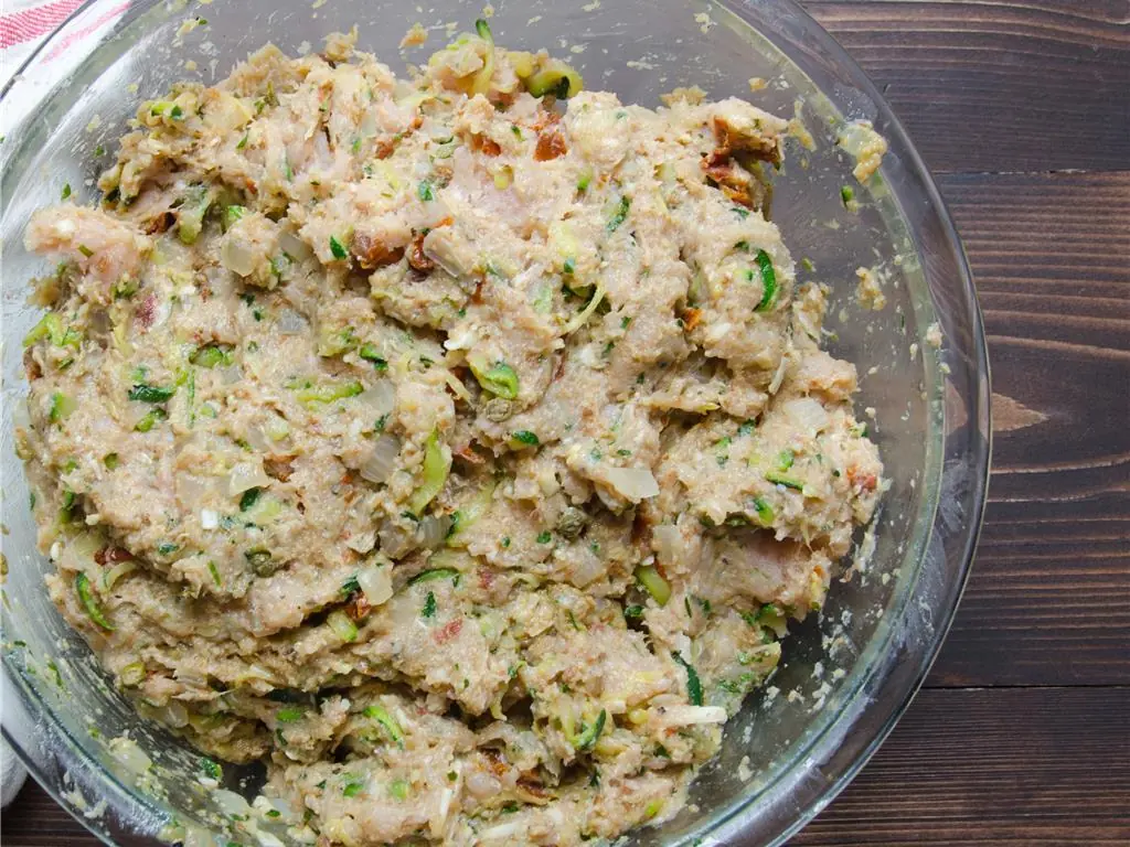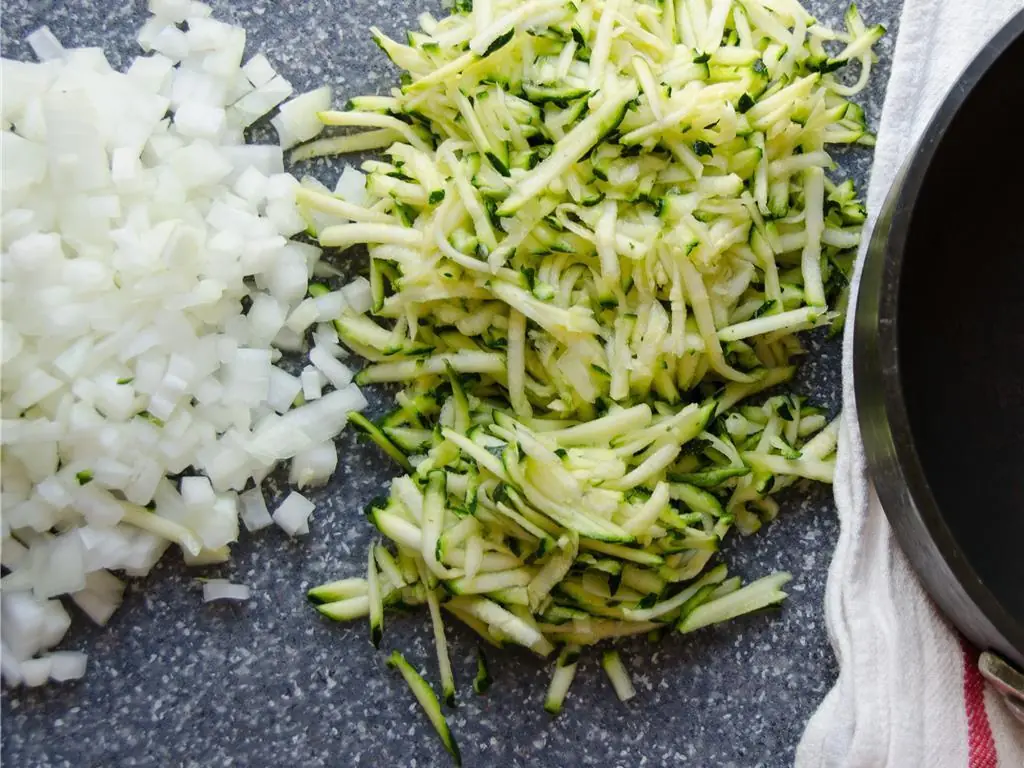 Finely chop the Onion (1), Grate the Zucchini (1). Drain and chop the Capers (1 1/2 Tbsp) and the Sun-Dried Tomatoes (1/2 cup). Finely chop the Garlic (1 clove). Set aside.