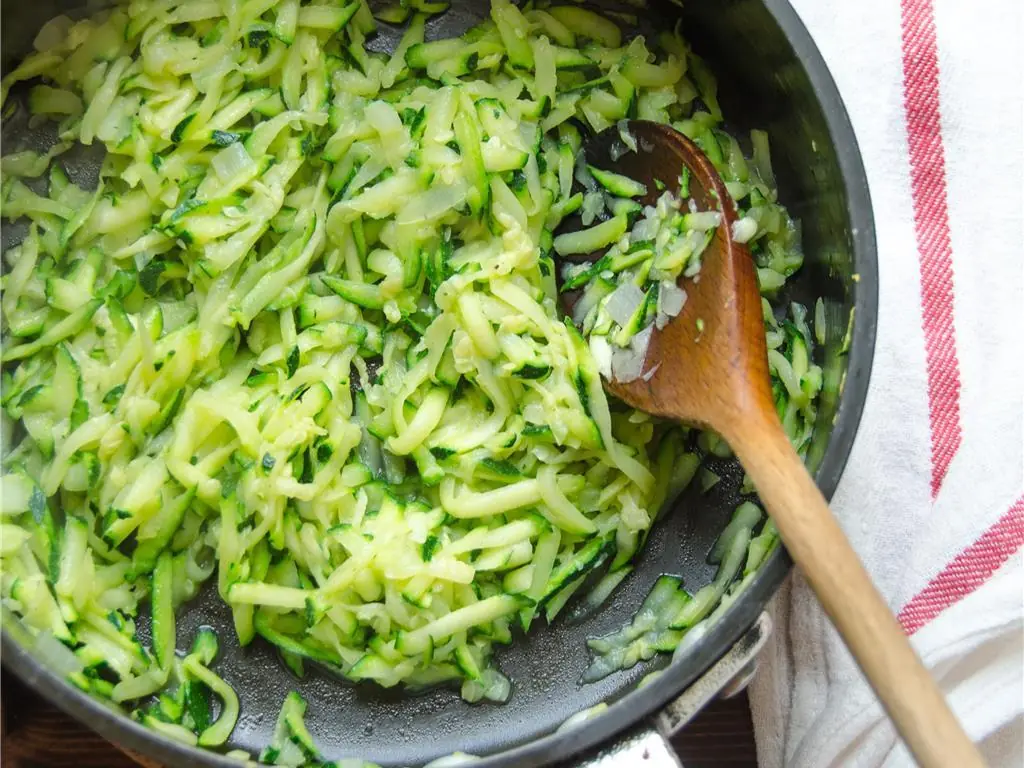 Add remaining Olive Oil (1 Tbsp) to the skillet and add the grated zucchini. Sprinkle with a pinch of salt and cook until zucchini is wilted and softened - about 5 minutes.