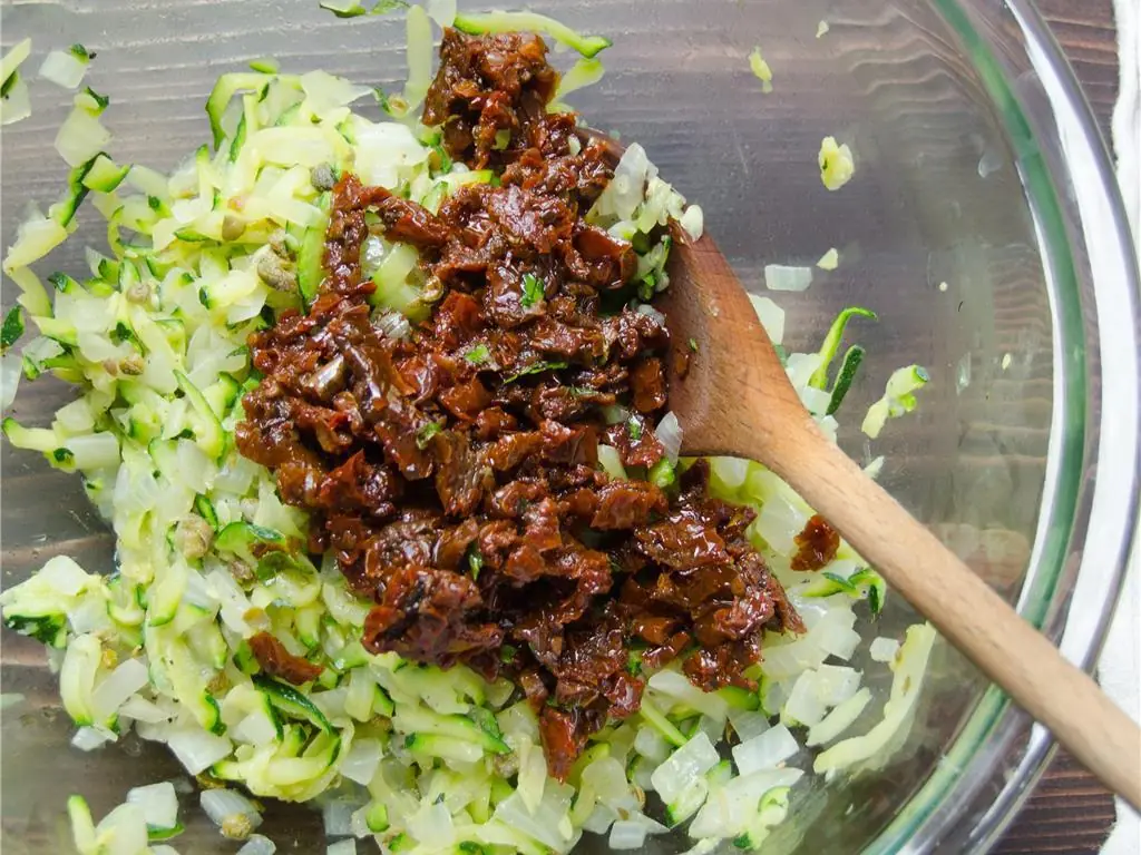 Transfer zucchini to the bowl with the onions. Add the capers and sun-dried tomatoes and stir to combine.