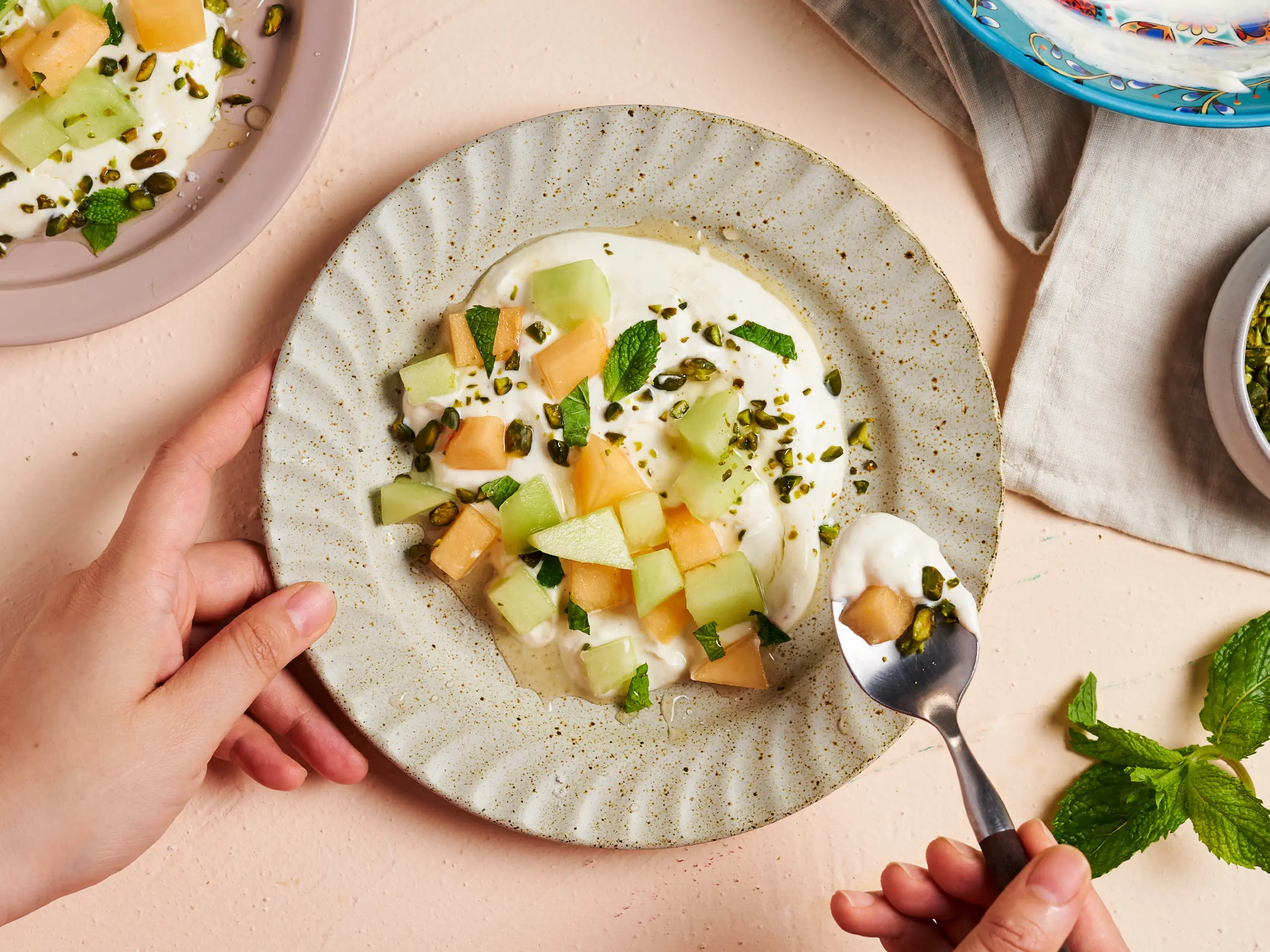 Dollop the yogurt onto the serving plate. Top with Honeydew Melon (1/4) and Cantaloupe (1/4). Sprinkle Pistachios (4 Tbsp), Fresh Mint (1 stalk), Lemon Zest, and Sea Salt Flakes (1 pinch). Drizzle some Honey (2 tsp) and serve.