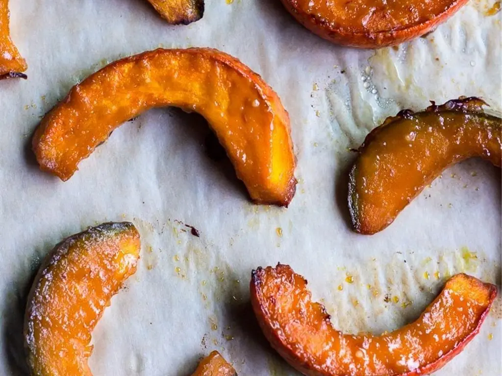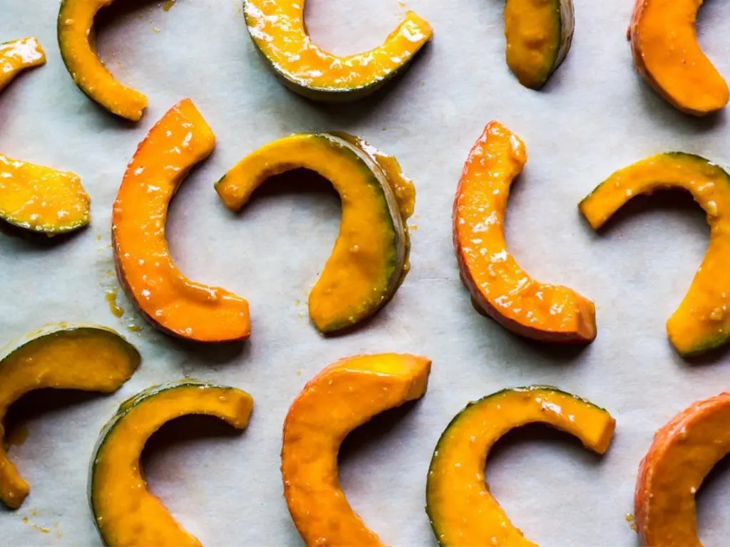 Toss Kabocha Squash (1) de-seeded and sliced into 1/2 inch slices in sauce, making sure to evenly coat each slice.
