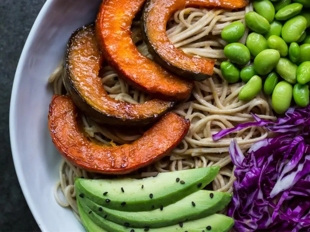 Soba can be eaten cold, hot, or in the case of this recipe, warm. Shredded cabbage and edamame add crunch and texture to the kabocha and soba, while the avocado compliments the creaminess of the dressing.